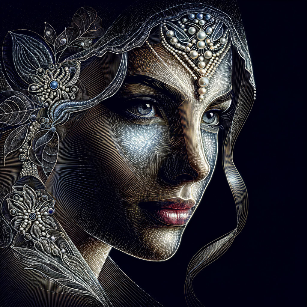 Prompt: Intricately detailed artwork depicting a portrait of an attractive woman, combining string art, iridescent beadwork and delicate linear silverpoint art, against a dark background. Soft lighting, chiaroscuro, soft colours