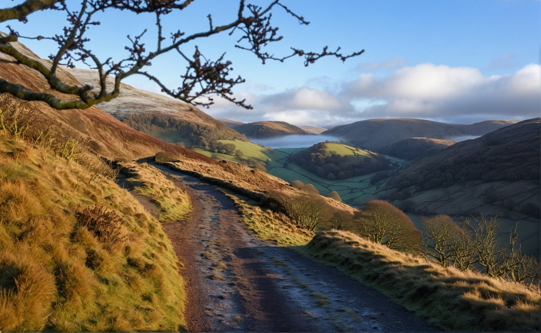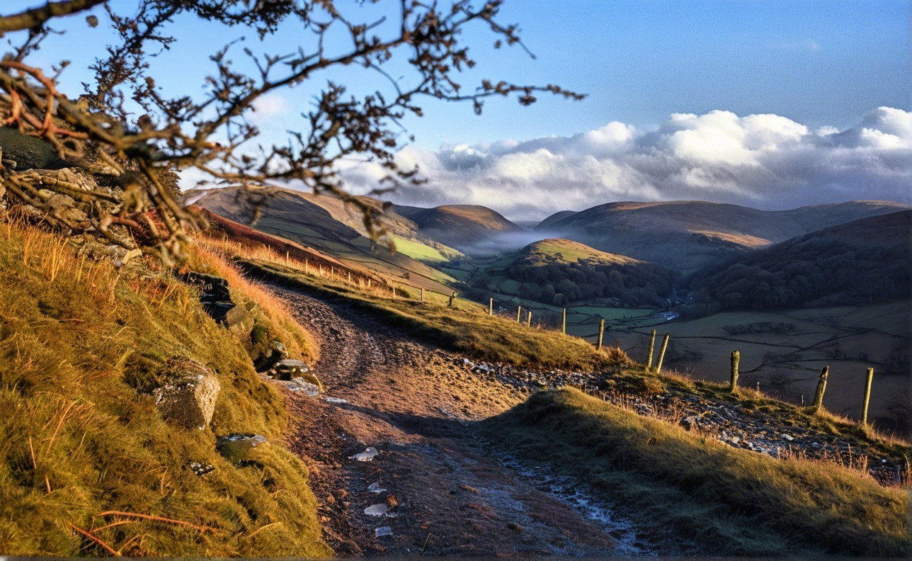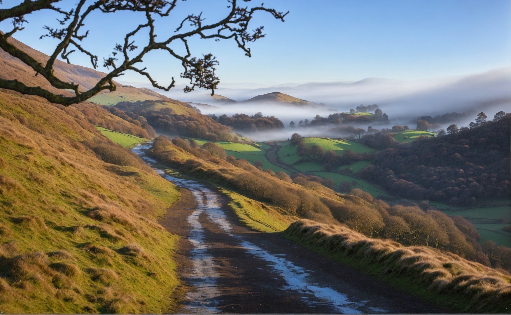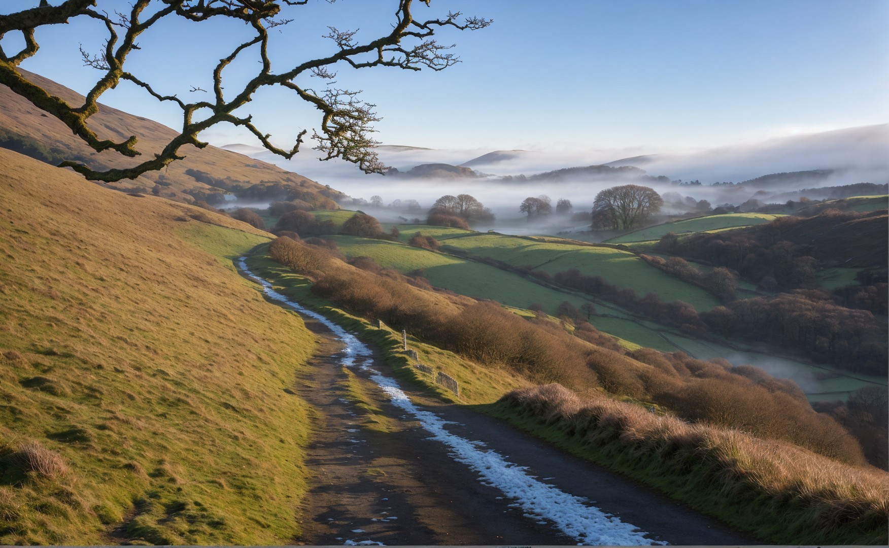 A tranquil landscape features a winding path through lush green hills, with mist rolling over the valleys. A gnarled tree stands on the hillside, enhancing the serene, atmospheric scene.