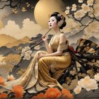 A serene woman in a golden gown sits among vibrant flowers and tropical parrots, with two luminous moons reflecting on a tranquil lake, creating a dreamlike tropical paradise.