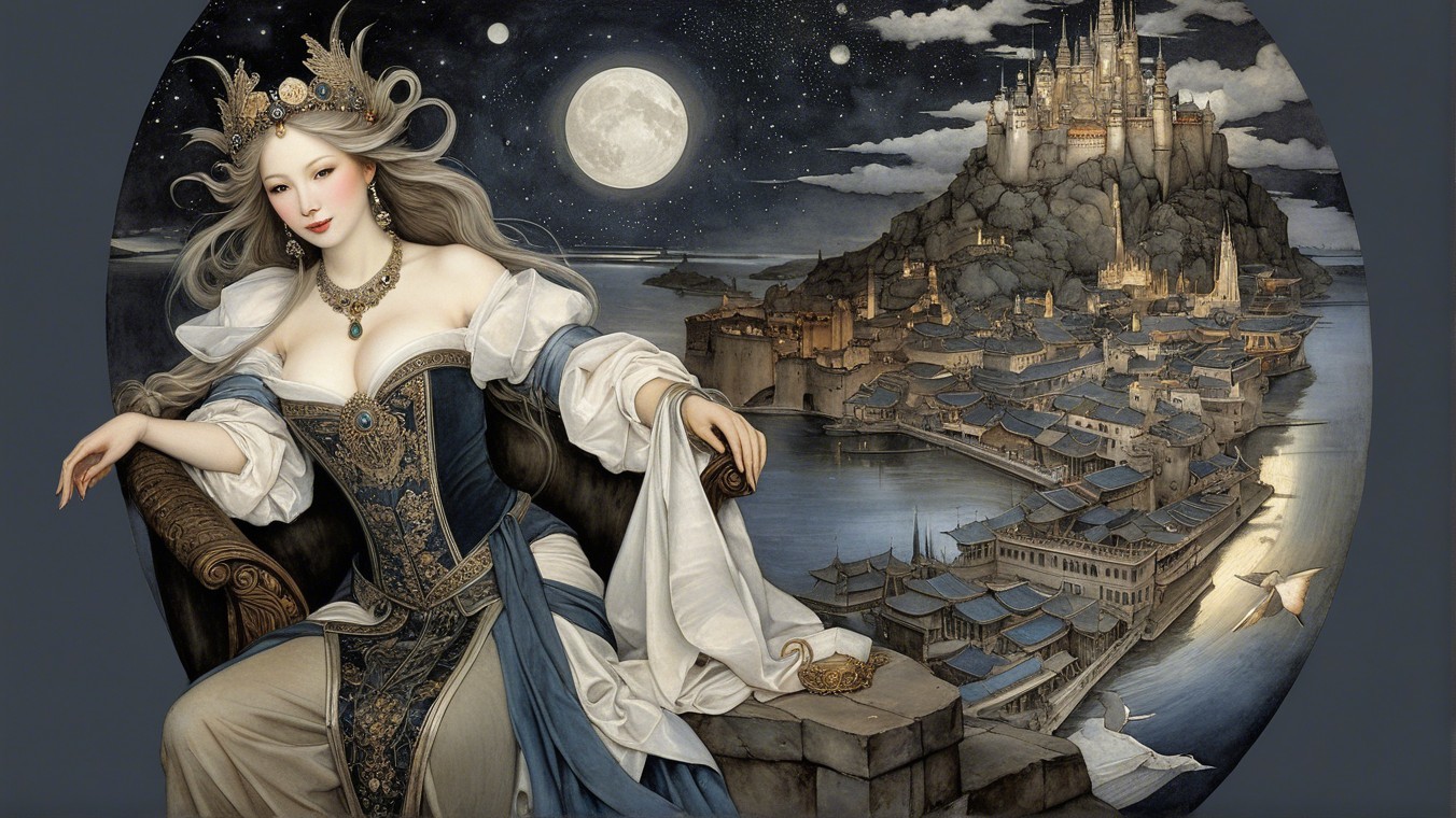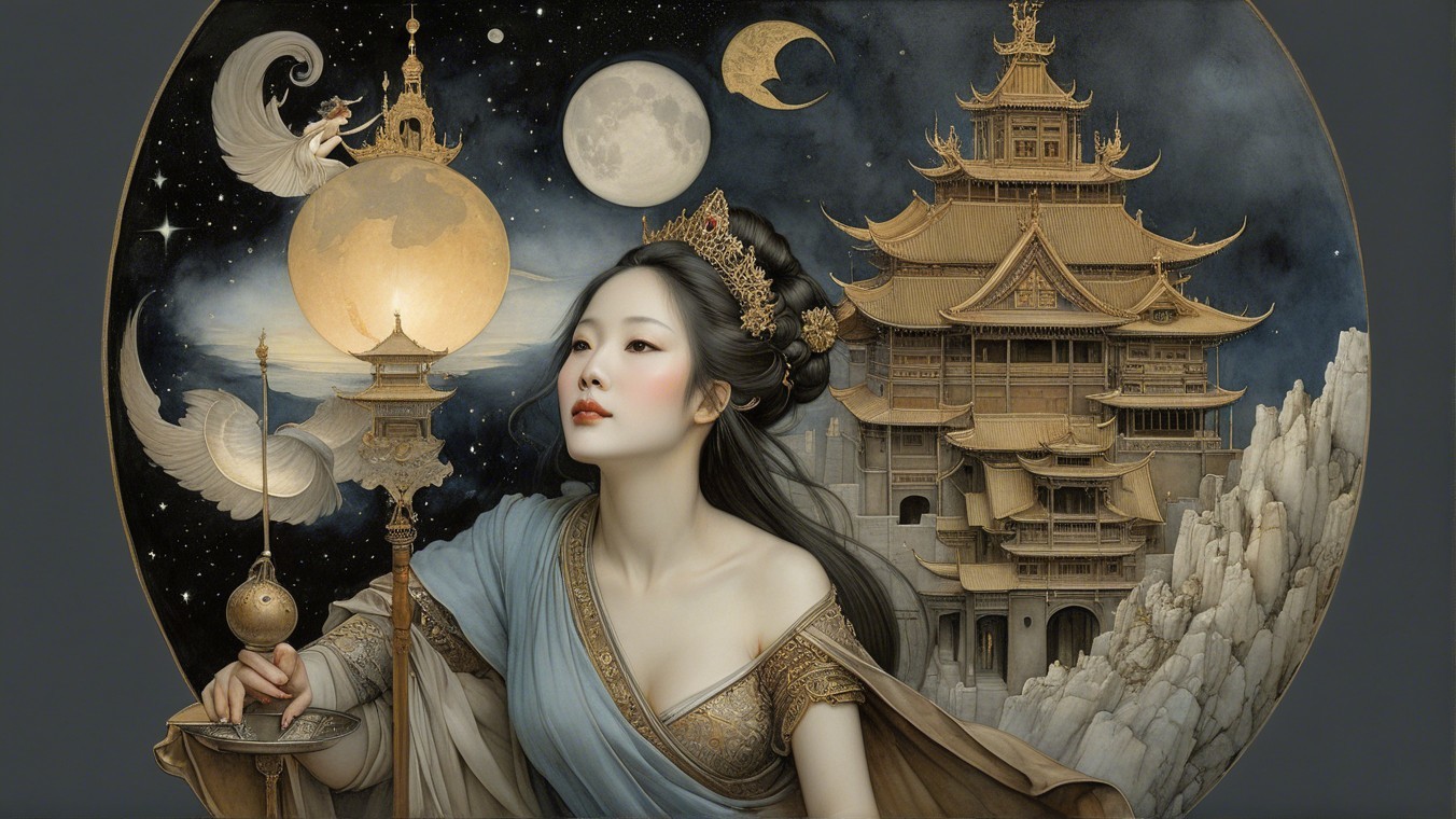 A serene figure with long dark hair and a crown, holding a brush, stands before a majestic pagoda. A large lotus blooms beside her under a starry night sky, adorned with crescent moons.