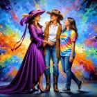 Three women stand together against a vibrant, colorful backdrop. One wears a purple, wide-brimmed hat and elegant dress, another dons western attire, while the third has a casual tie-dye shirt.