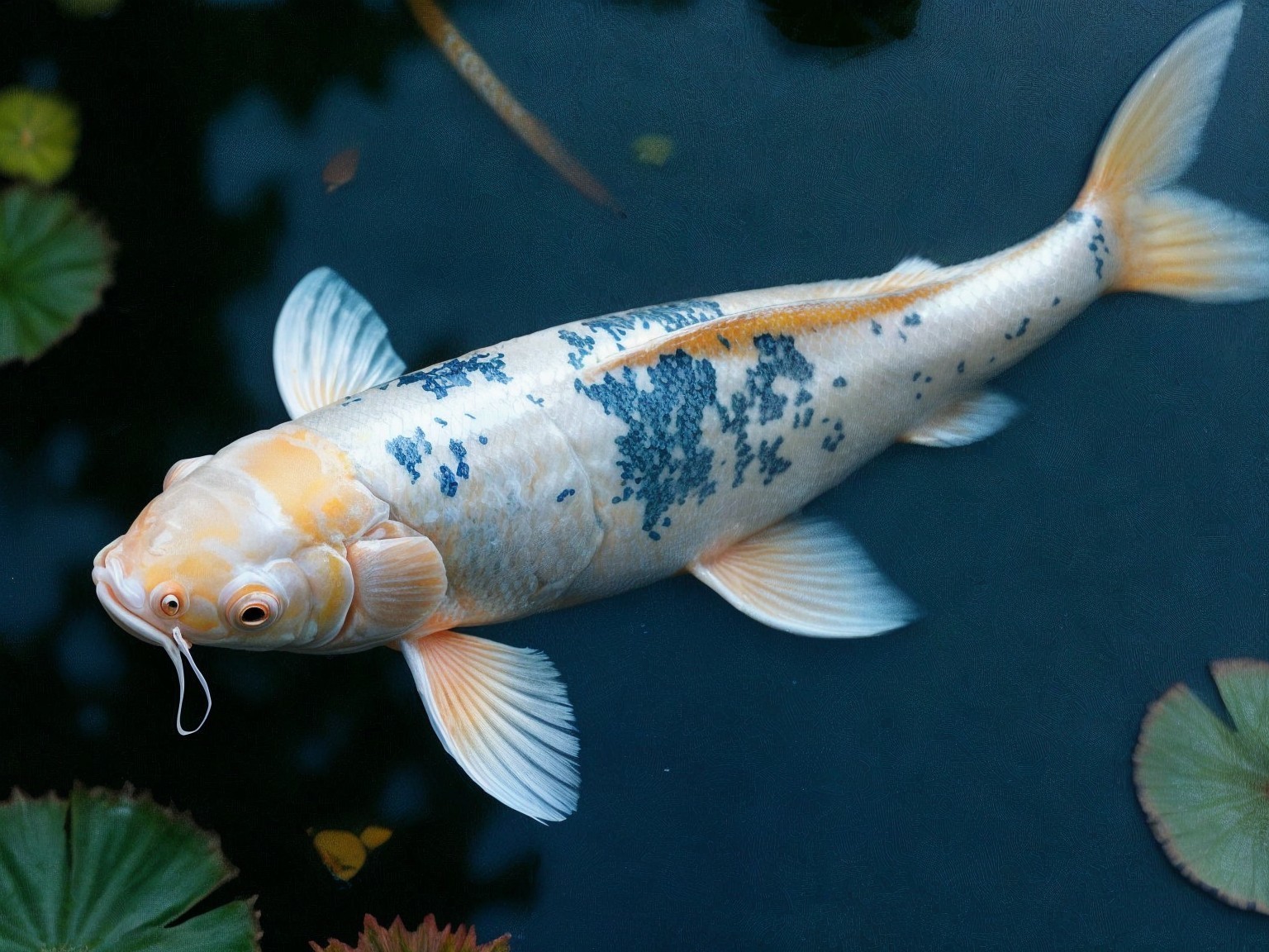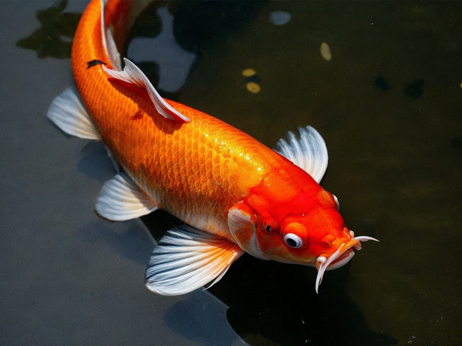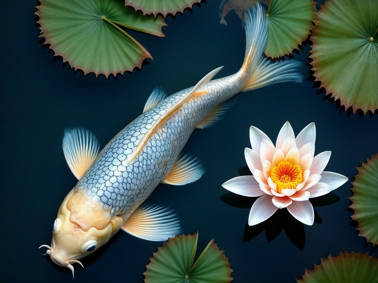 A beautiful koi fish with vibrant orange and white patterns swims gracefully amidst pink water lilies on a serene pond, surrounded by green lily pads under a calm, reflective surface.