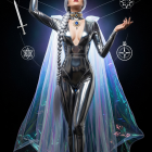 A futuristic figure stands confidently in a shiny silver outfit, accented with a flowing white cape. She poses among floating celestial bodies, exuding a cosmic and ethereal vibe.
