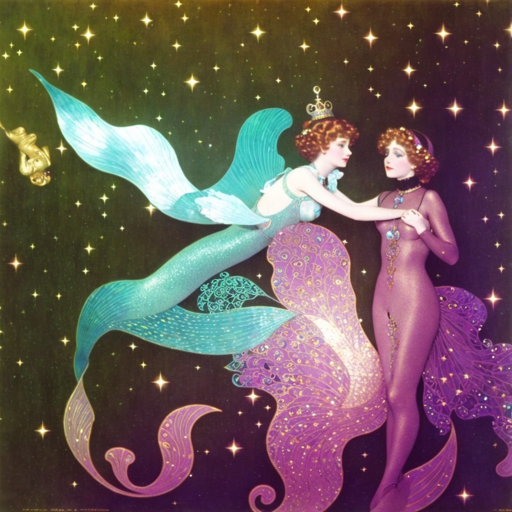 Two stylized mermaids with sparkling tails and wings against a starry backdrop, one in green, the other in purple, appearing to embrace.