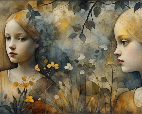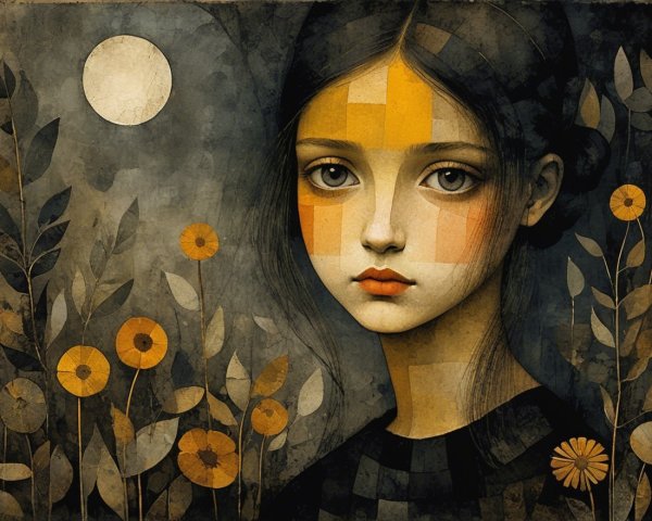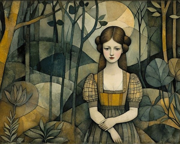 A beautifully detailed skeleton wearing a large, ornate hat adorned with flowers and a skull. The backdrop features a serene landscape with trees, creating a hauntingly elegant atmosphere.