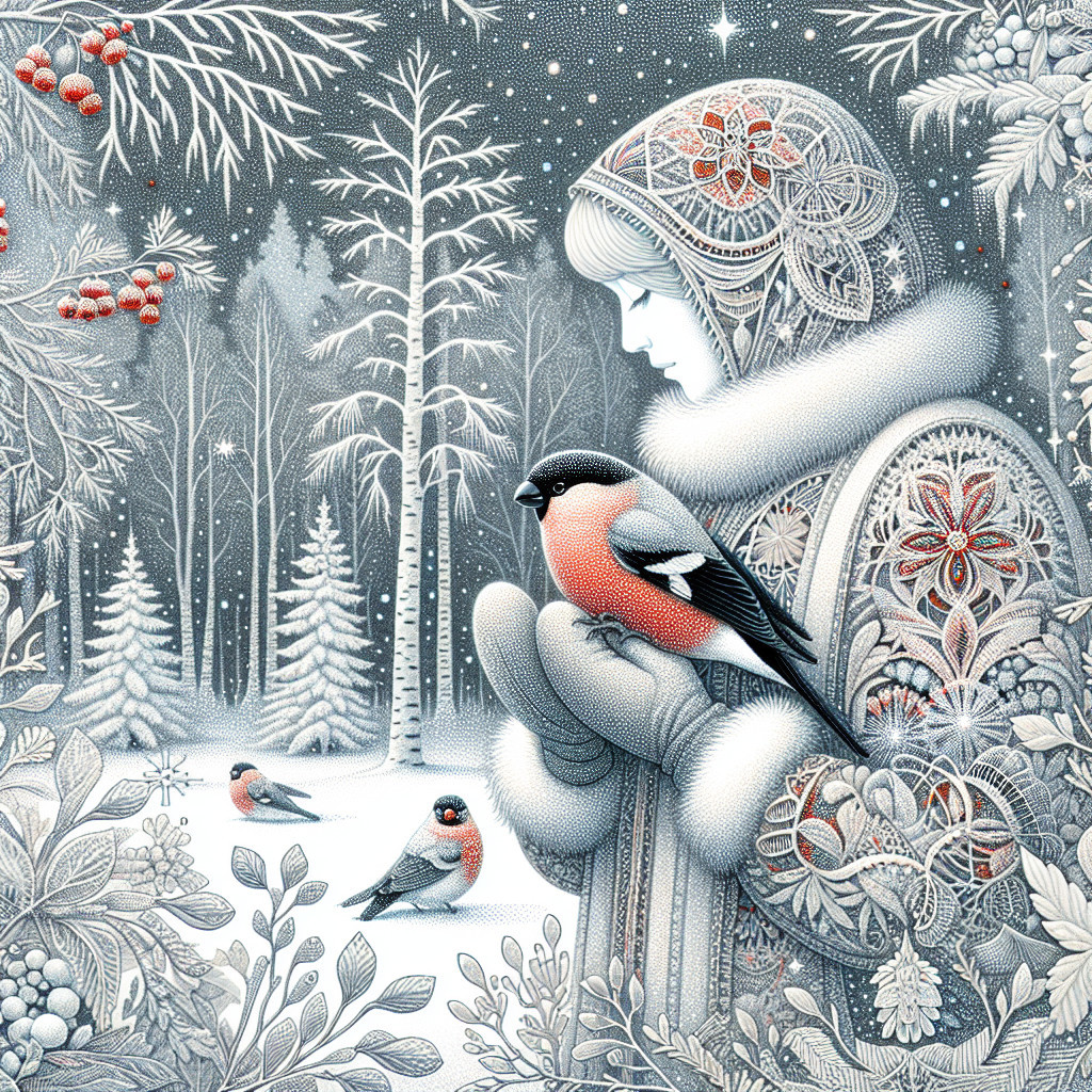 A beautiful, elegant winter scene with a woman holding a small bird in her hands. The intricate artwork showcases a winter wonderland full of snow, trees, and berry branches. The woman is wearing a warm, furry coat and a detailed head covering, both adorned with decorative floral patterns. Her fair skin and
