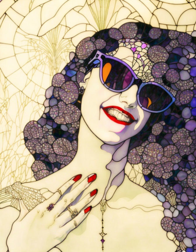 Colorful Sunglasses Woman Illustration with Red Lipstick and Mosaic Background