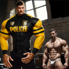 The image features two muscular police officers. One has an exaggerated, heroic physique in a black and yellow uniform, while the other has a lean, defined build, showcasing strength and fitness.