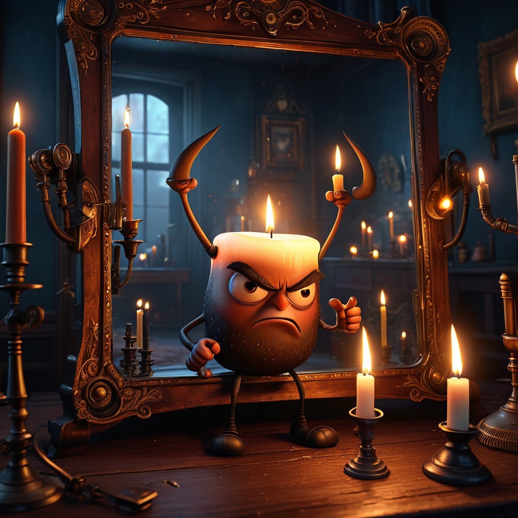 In a dimly lit room, an animated candle with an angry expression stands confidently, holding a lit match, surrounded by flickering candles and an ornate mirror reflecting the scene.