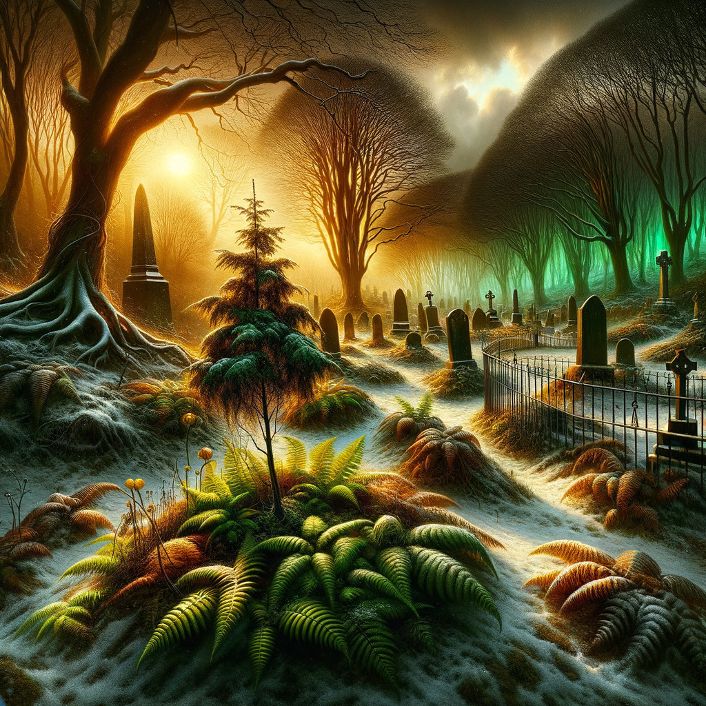Prompt: dark fantasy cemetery. WOODLAND BURIAL.Beautiful twilight. winter, Lay me in some leafy loam where, sheltered from the cold,Little seeds investigate and tender leaves unfold.There kindly and affectionately, plant a native tree,Captivating surrealism & beauty at its finest - A woodland cemetery made of different shades of green, yellow & warm hue. beautiful blend of cool and warm colors with the golden sun joining the dance.intricate detailed line work, integrated diverse textures,