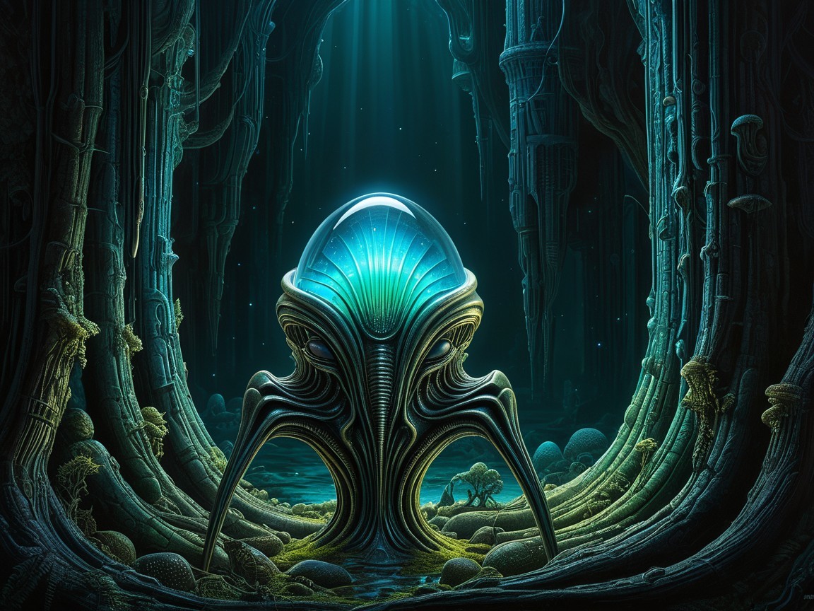 A surreal, otherworldly scene features a large, intricately designed alien figure with a glowing head, surrounded by dark, textured greenery and mysterious structures in a dreamy, aquatic environment.