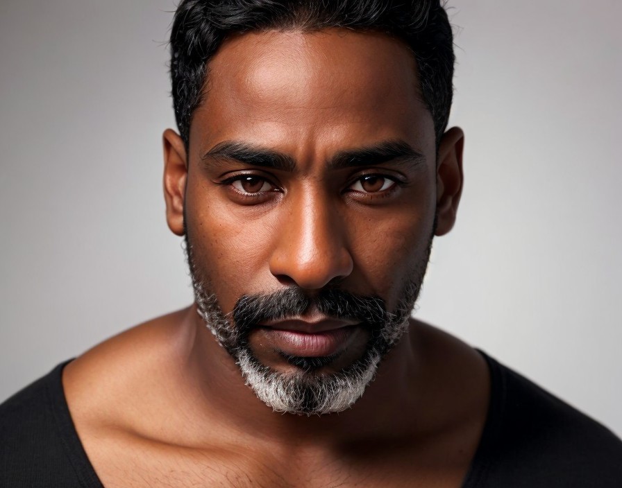 A portrait of a man with dark skin, a beard with white patches, and intense eyes.