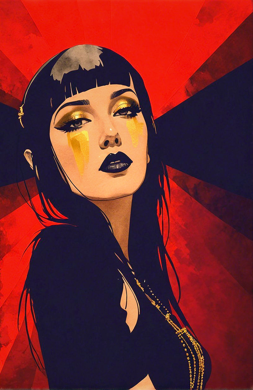The image features a striking female figure with bold makeup, including gold accents and dark lipstick, set against a vibrant red background, creating a dramatic and artistic effect.