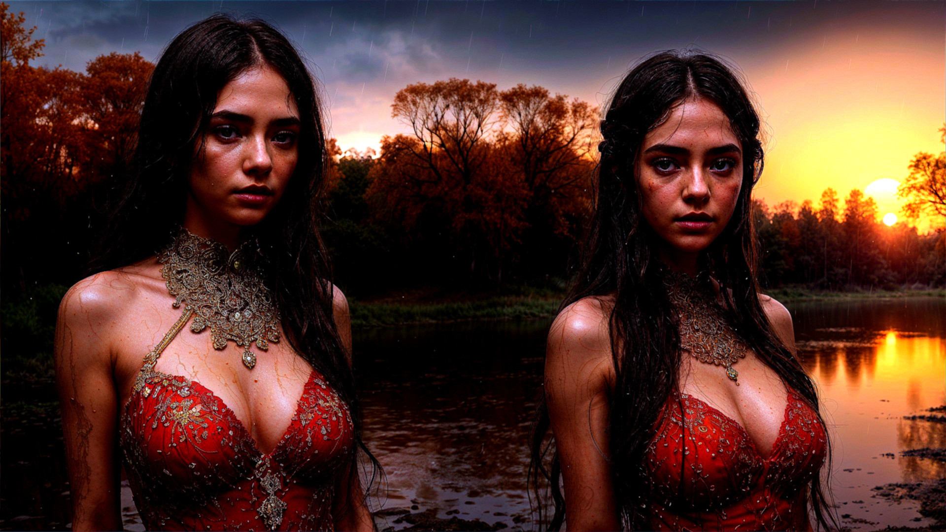 A stunning woman in a short dress, covered in mud and scars, stands in a post-apocalyptic village. Surrounded by red moons, raindrops, and vibrant flowers, the scene is both surreal and elegant, showcasing intricate details and dynamic lighting.