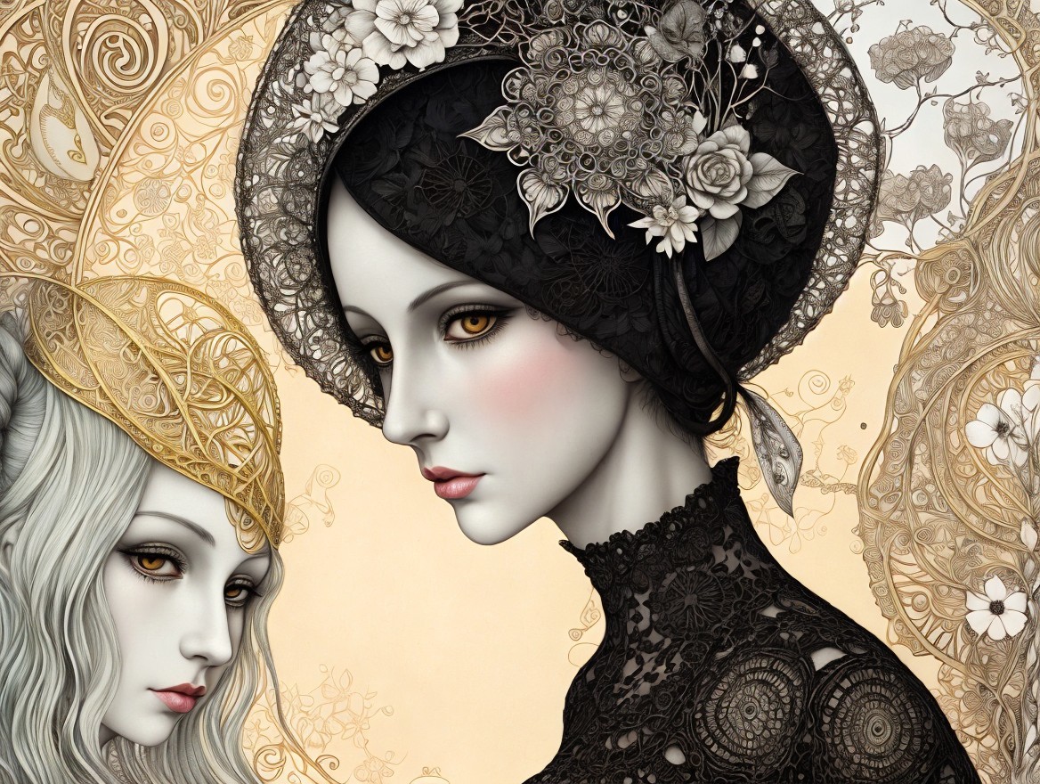 The image features a woman with an elegant hairstyle adorned with a decorative flower. Her pale complexion contrasts with the intricate, swirling patterns and warm tones in the background.