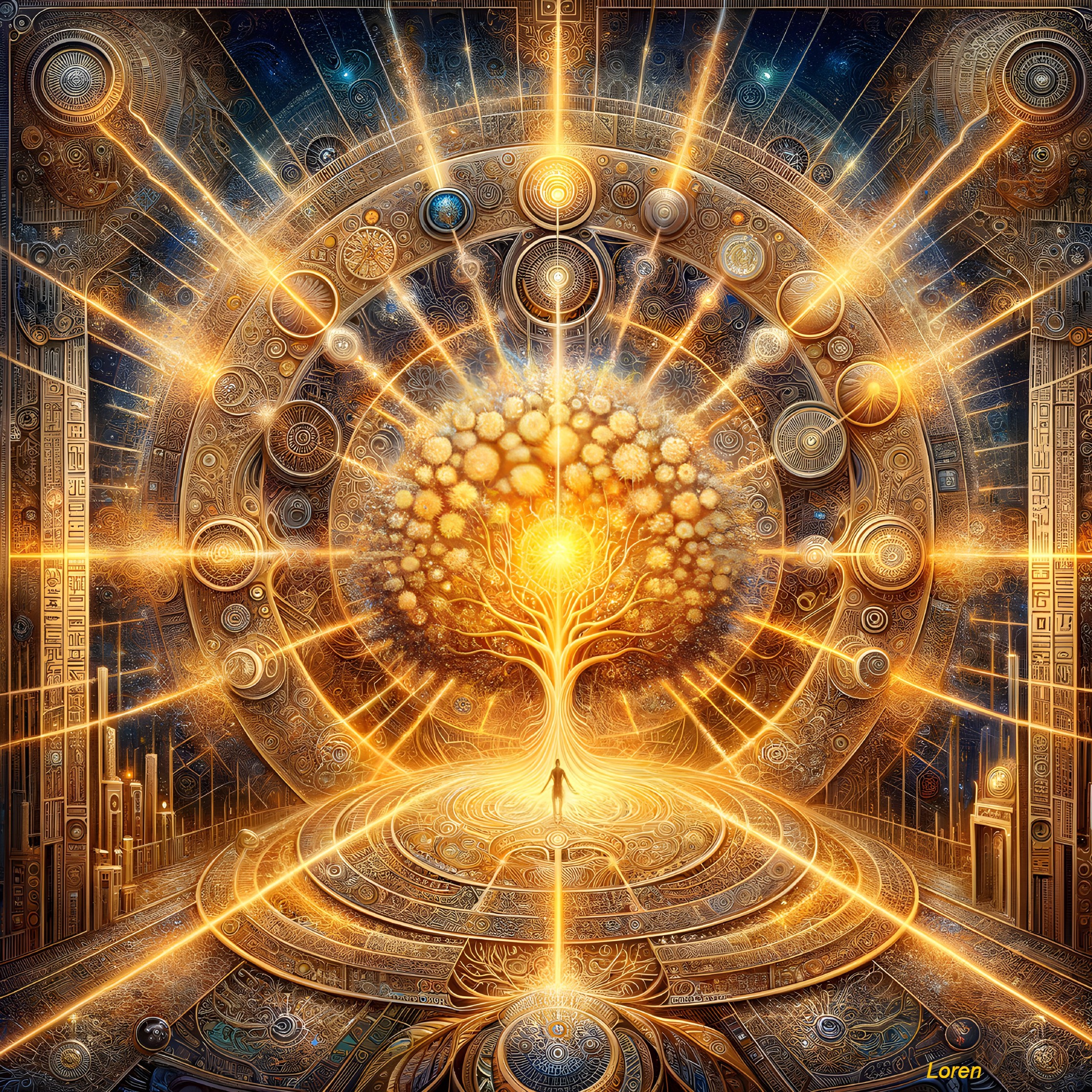 A visually rich, symbolic illustration featuring a glowing tree, cosmic patterns, and a central human-like figure, alluding to spiritual and metaphysical themes.
