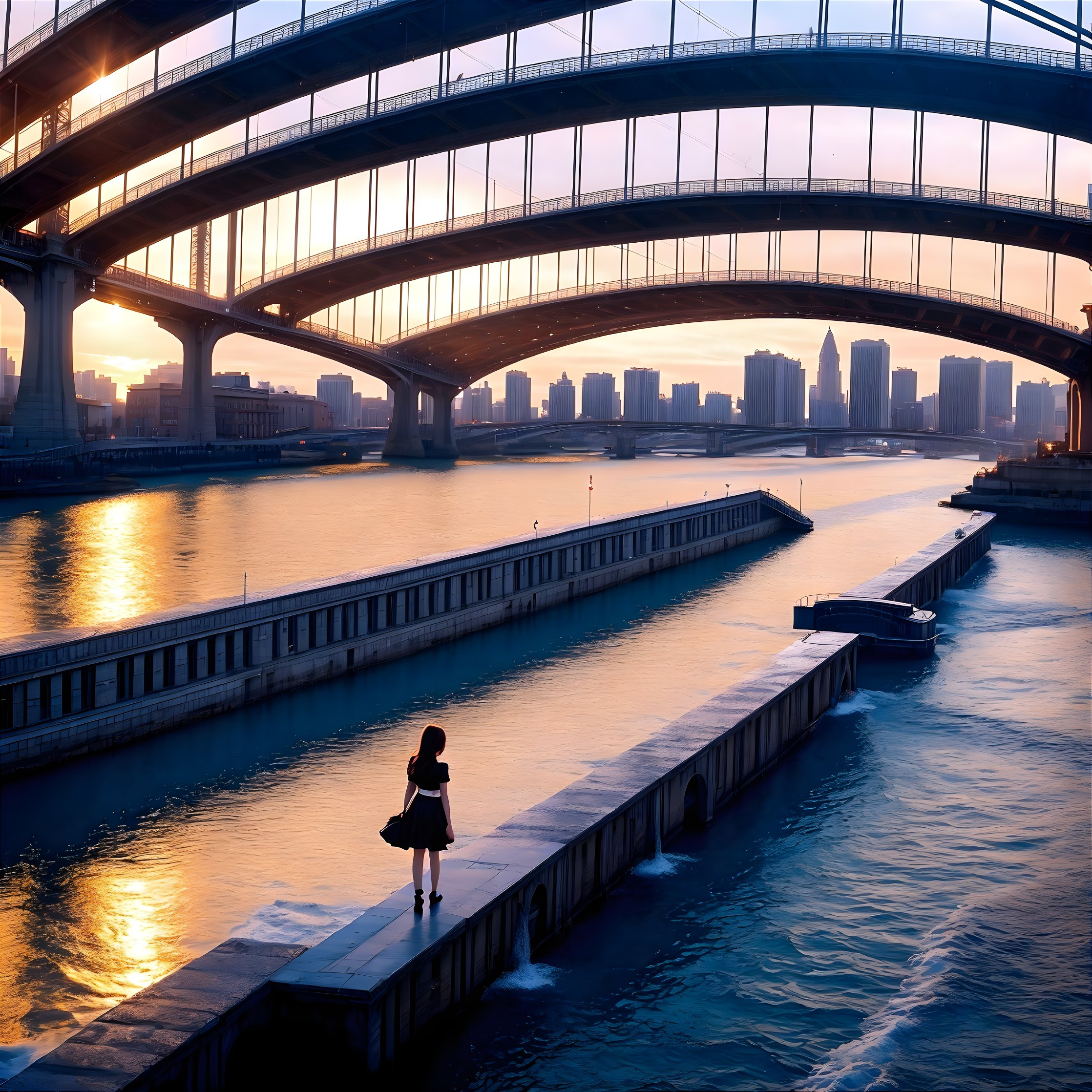 A person stands on a dock during sunset with cityscape and layered bridges in the background, reflecting on tranquil water.