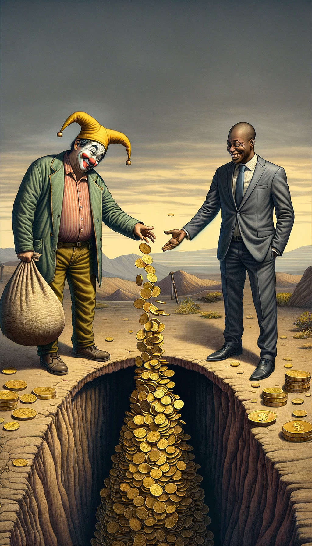 Clown and Businessman Create Coin Bridge Over Canyon