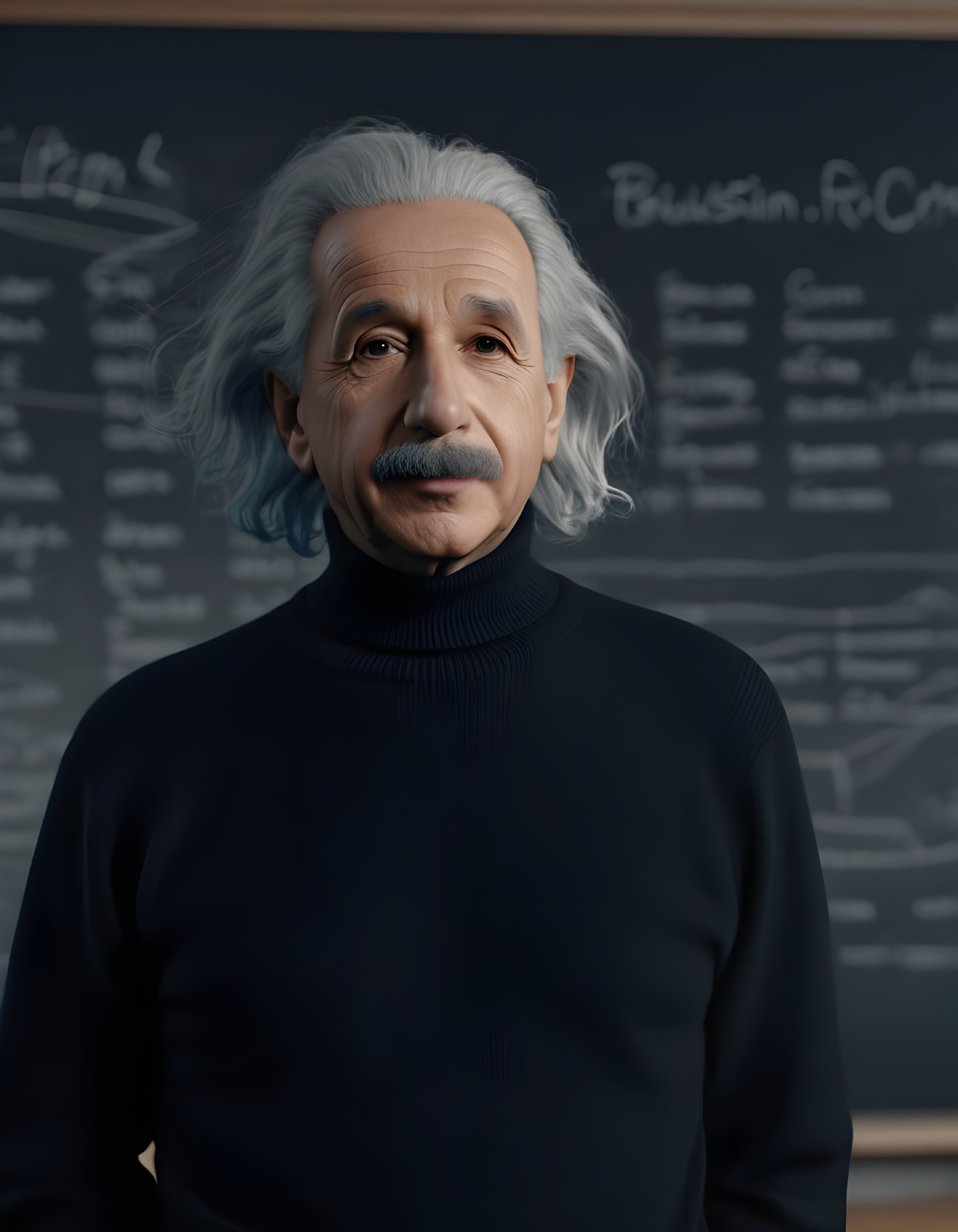 A 3D rendering of a man resembling Albert Einstein in a black turtleneck, standing in front of a chalkboard filled with equations.