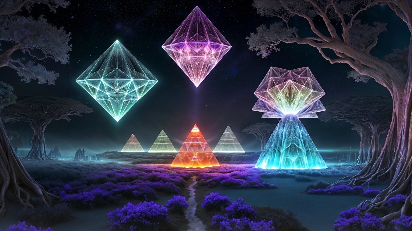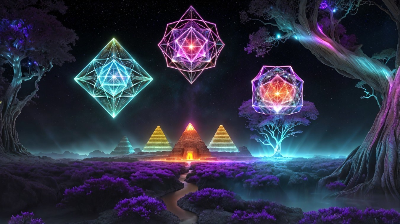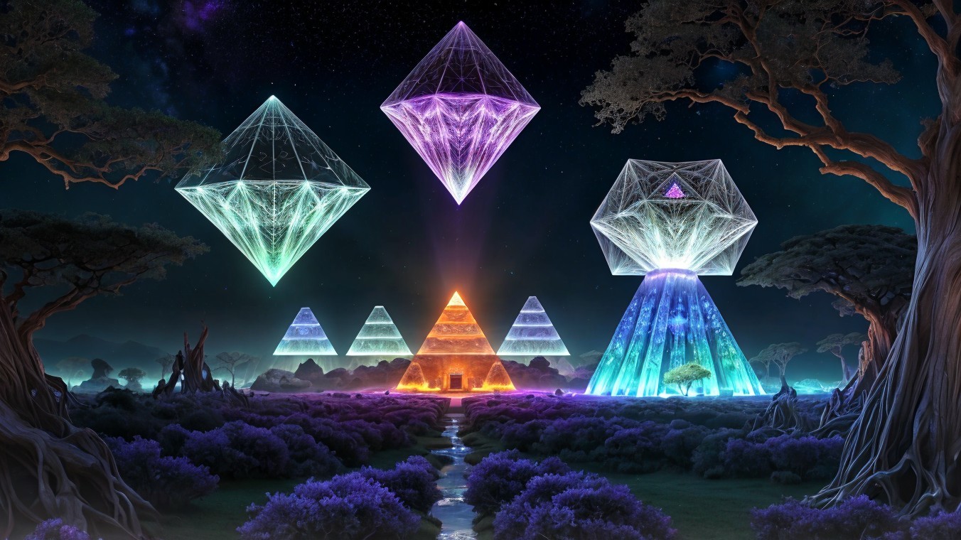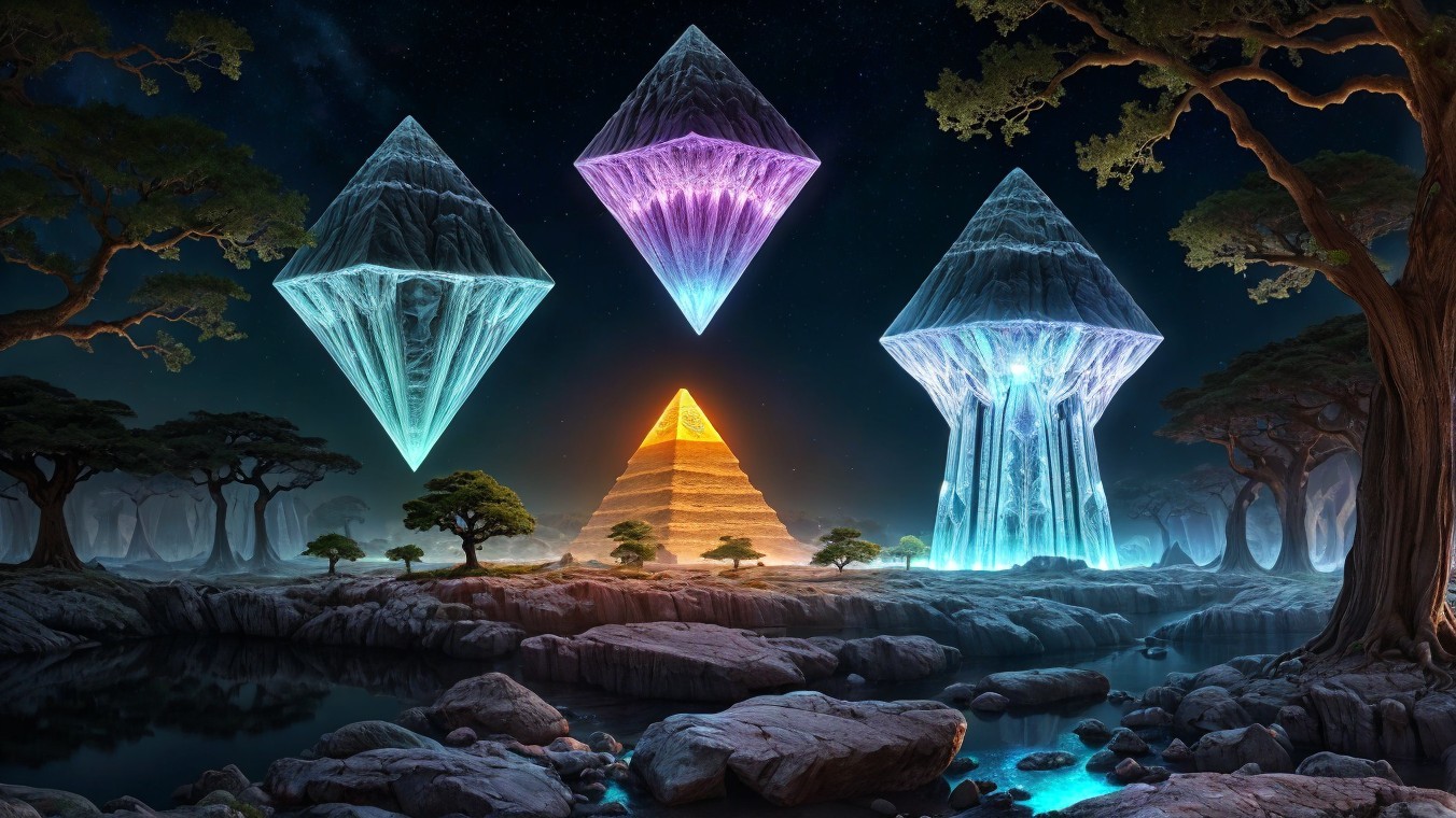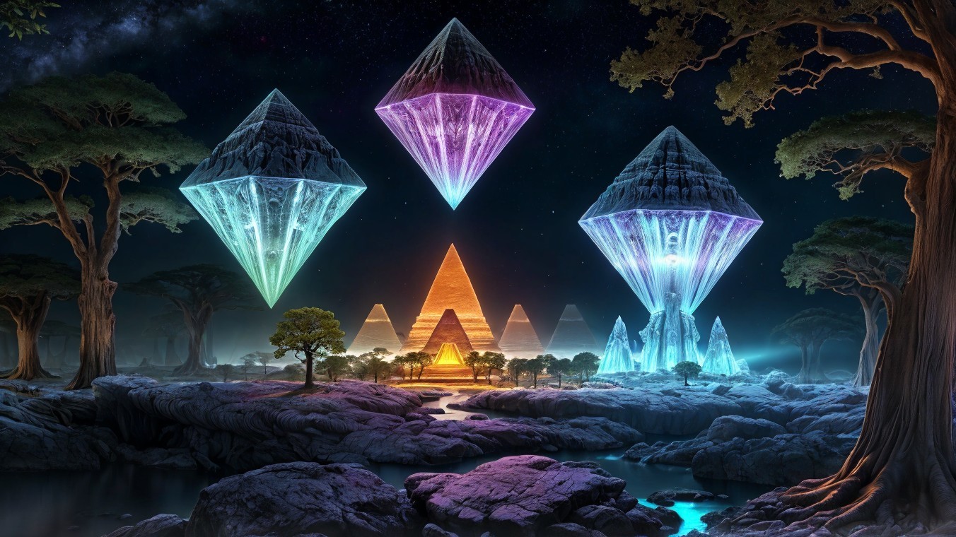 Majestic oak tree, embodiment of the tree of life, divine extraterrestrial pyramid, sinuous roots like a flowing river, ethereal glow, mysterious runes, high-tech alien menagerie temple pyramid, advanced extraterrestrial technology, sacred geometry, glowing crystalline structures, minerals, geode crystals, phosphorescent elements, hexagon patterns, colossal mineral crystals, ultra-realistic, dynamic landscape, complex cosmic sky, Cameron Gray's unique style.
