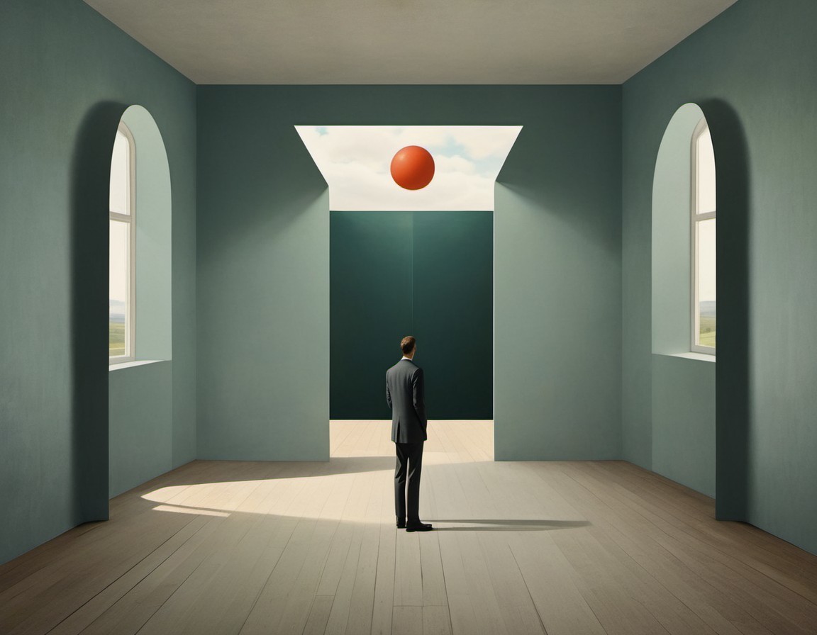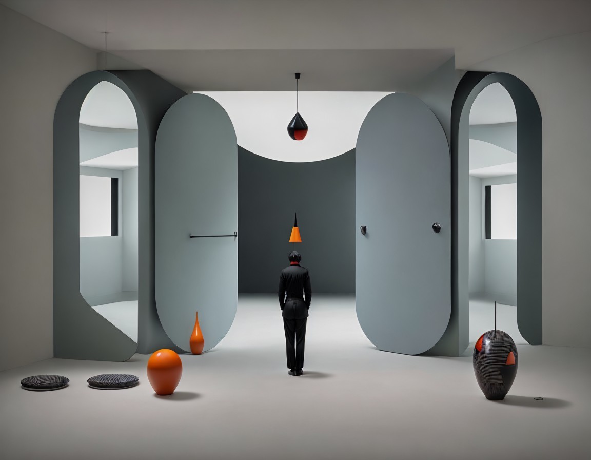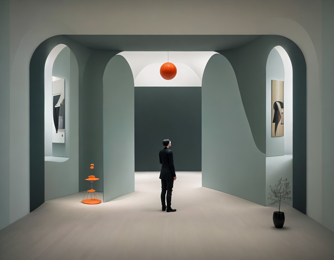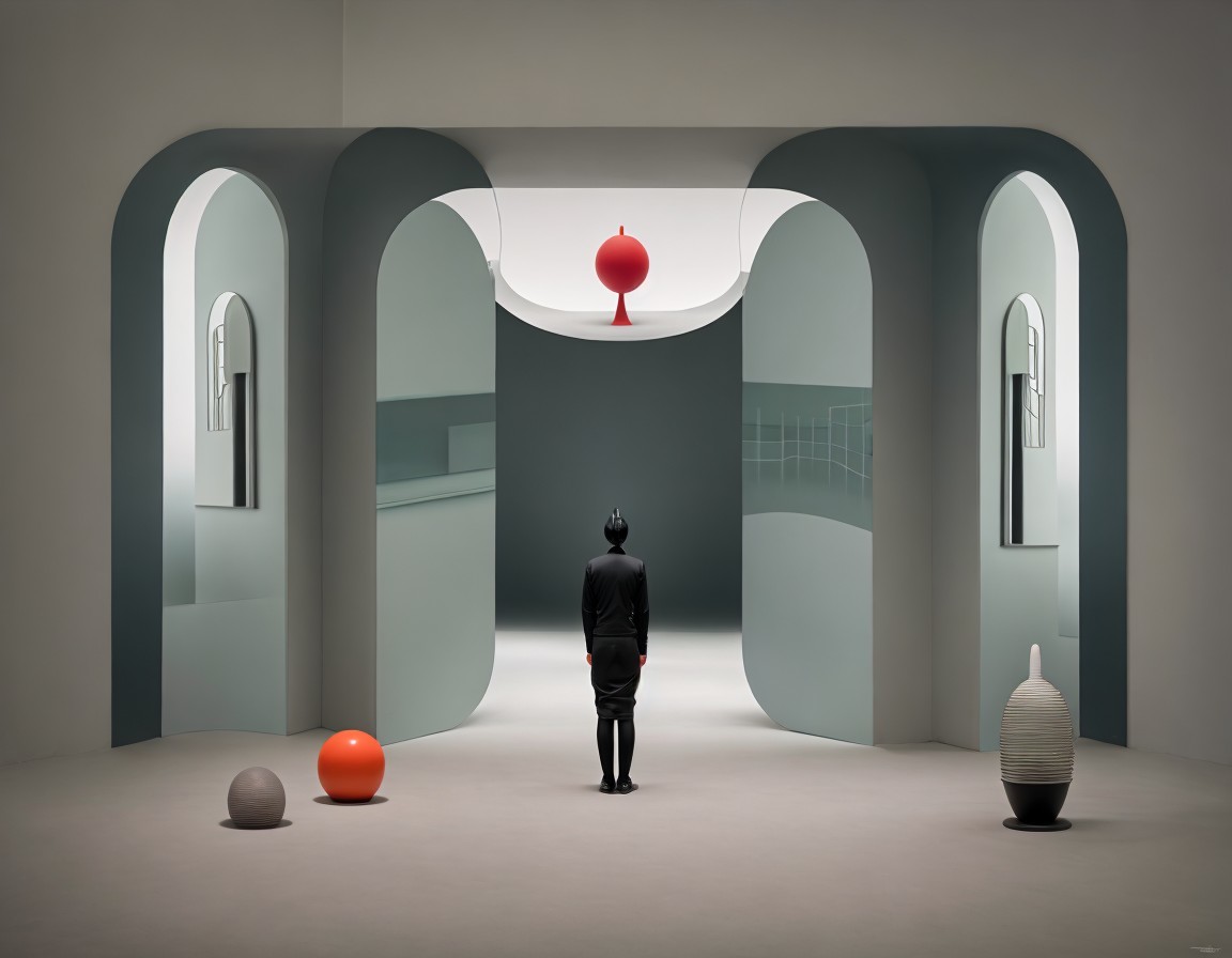 A person stands in a minimalist room with archways and abstract objects; the scene is stylish with a monochromatic palette punctuated by colored spheres.