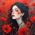 A surreal portrait features a woman with vibrant purple curls and striking makeup, set against a vivid orange backdrop with whimsical trees, creating an enchanting, dreamlike atmosphere.