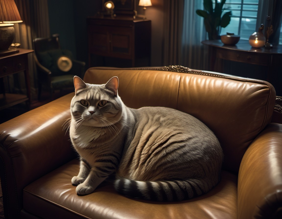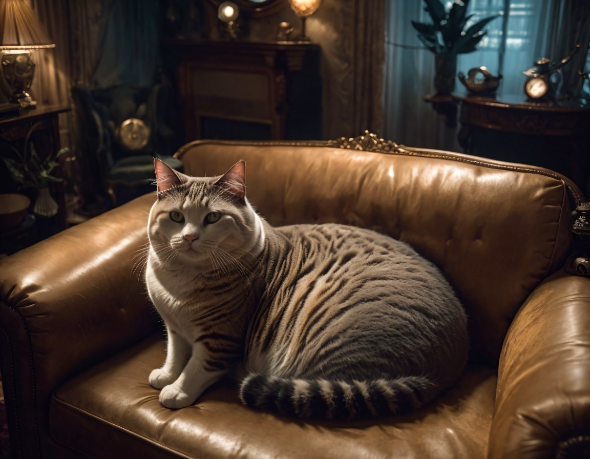 A plump striped cat with piercing eyes sits majestically on an elegant leather couch, surrounded by a rich, moody vintage decor.