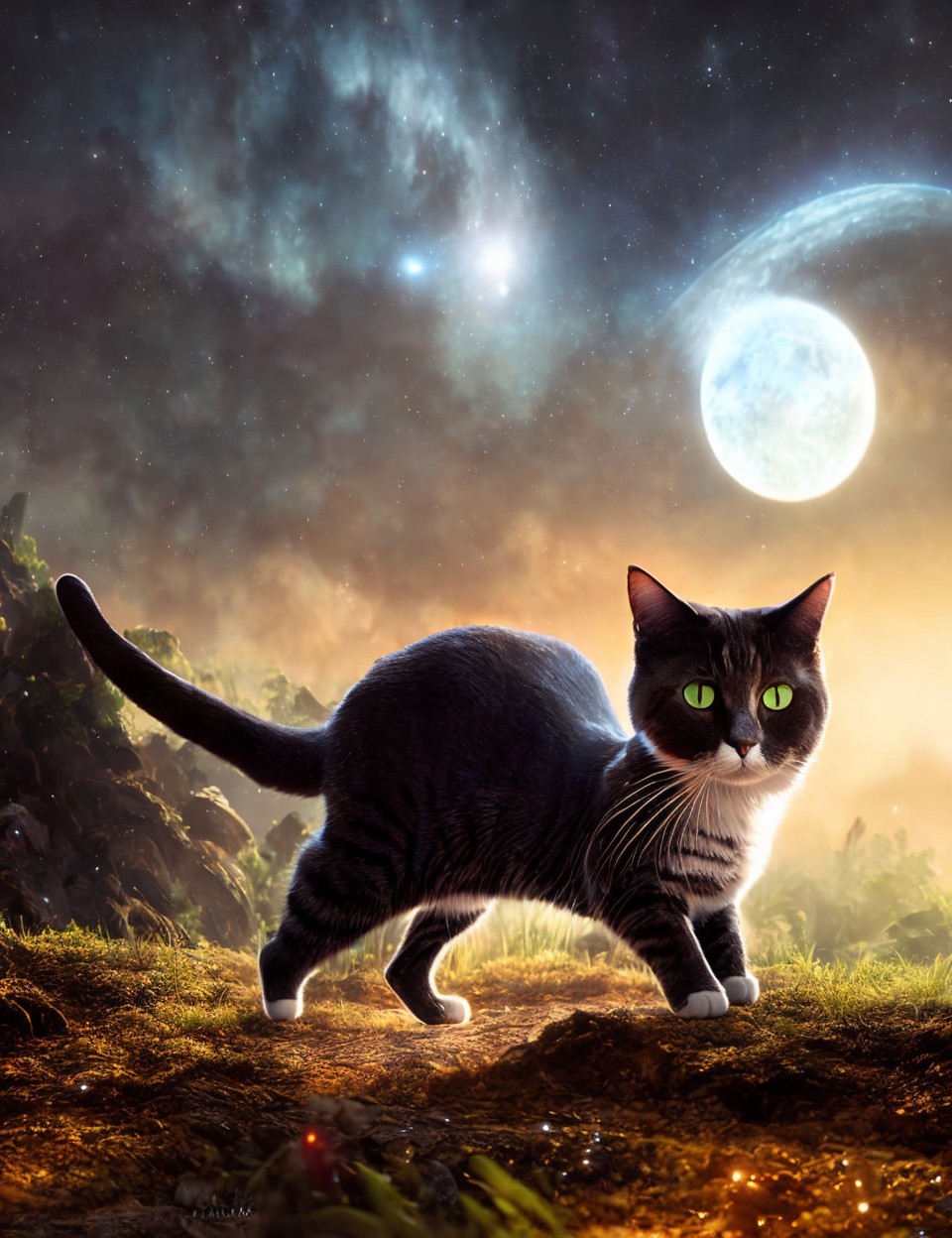 A striking cat with a black and white coat stands on a surreal landscape, under a starry sky with two glowing moons. The scene blends fantasy and reality, creating a dreamlike atmosphere.