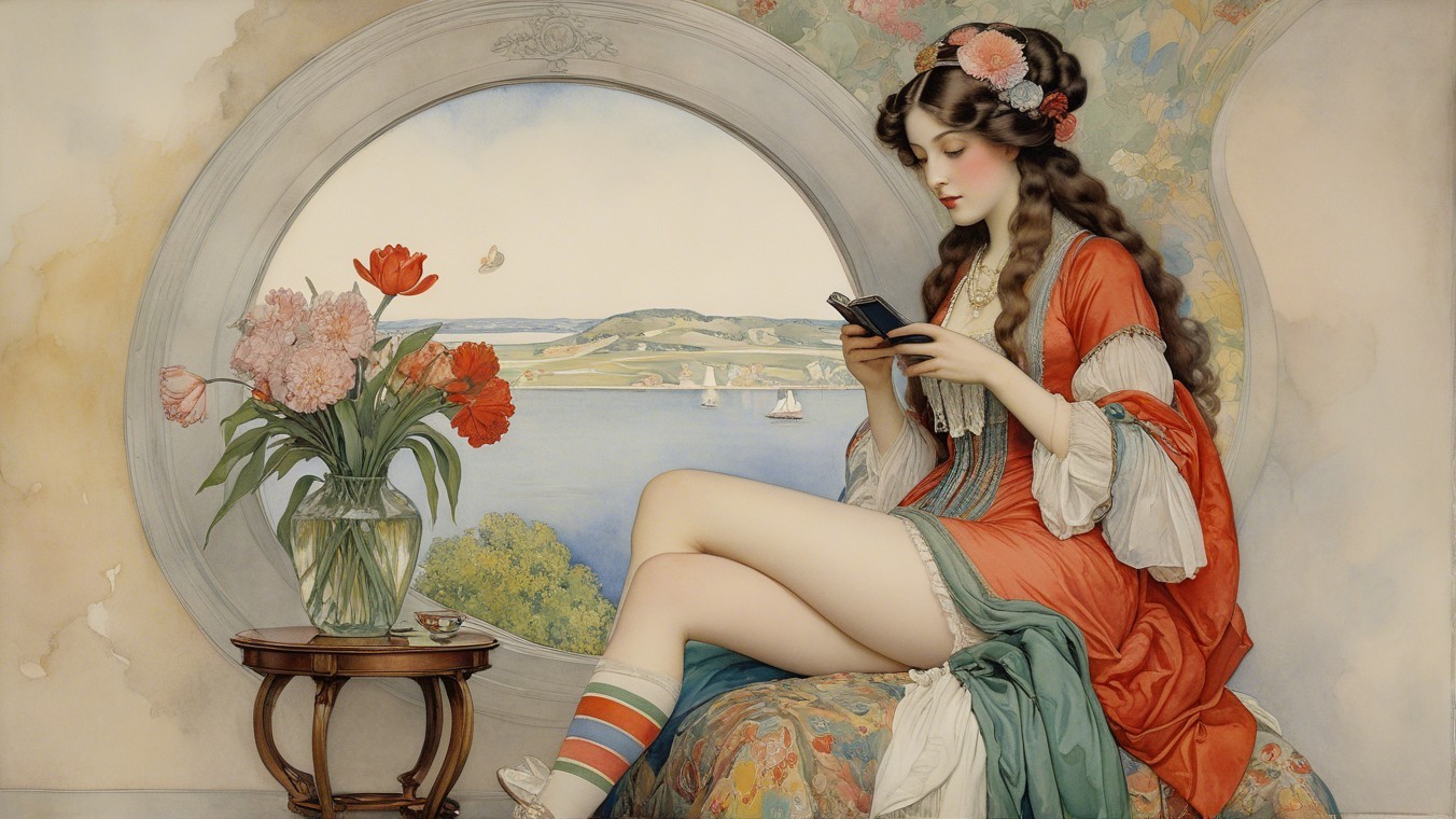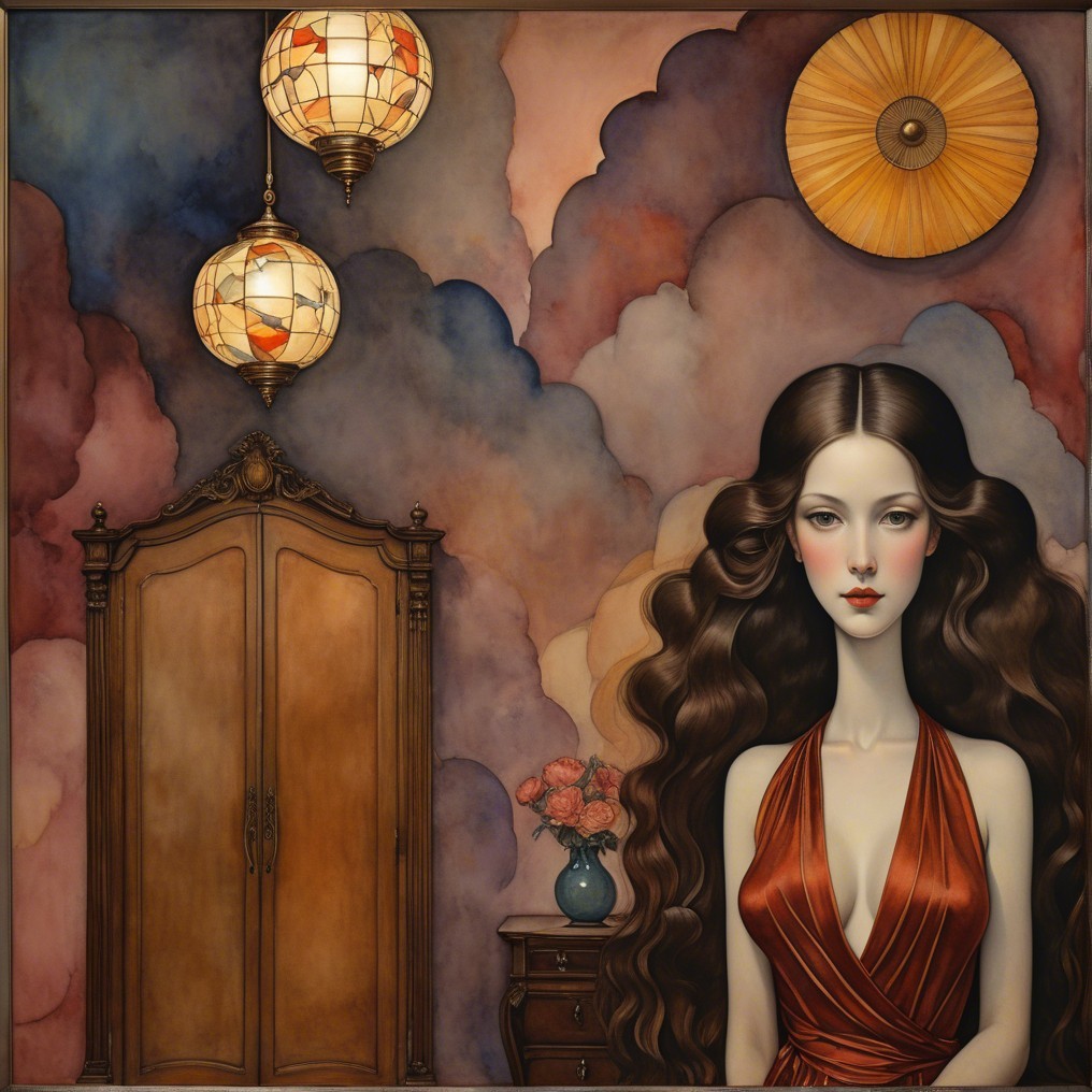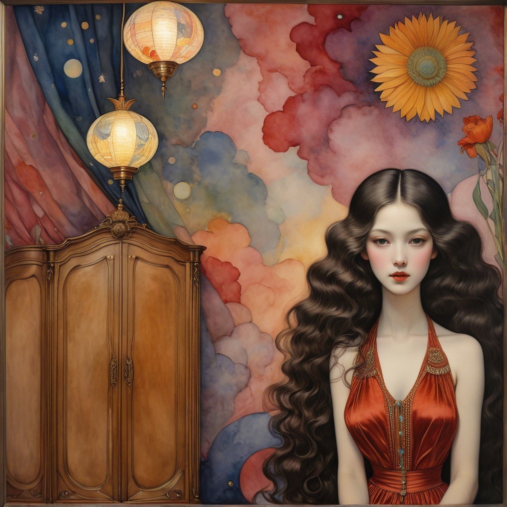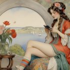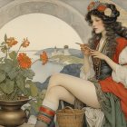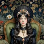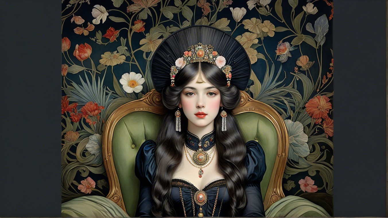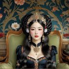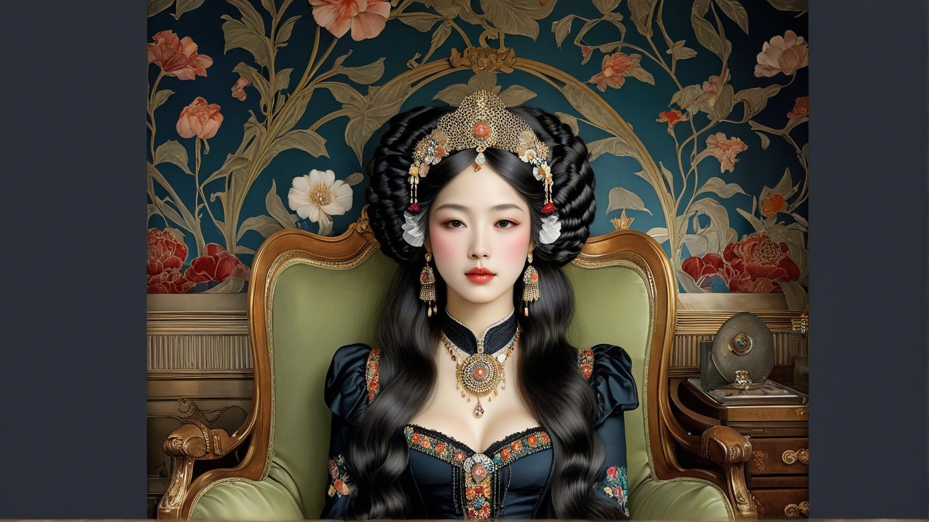 A luxurious bedroom adorned with floral murals and an ornate ceiling. A plush blue bed sits center, flanked by elegant nightstands and soft lighting, creating a serene and opulent atmosphere.