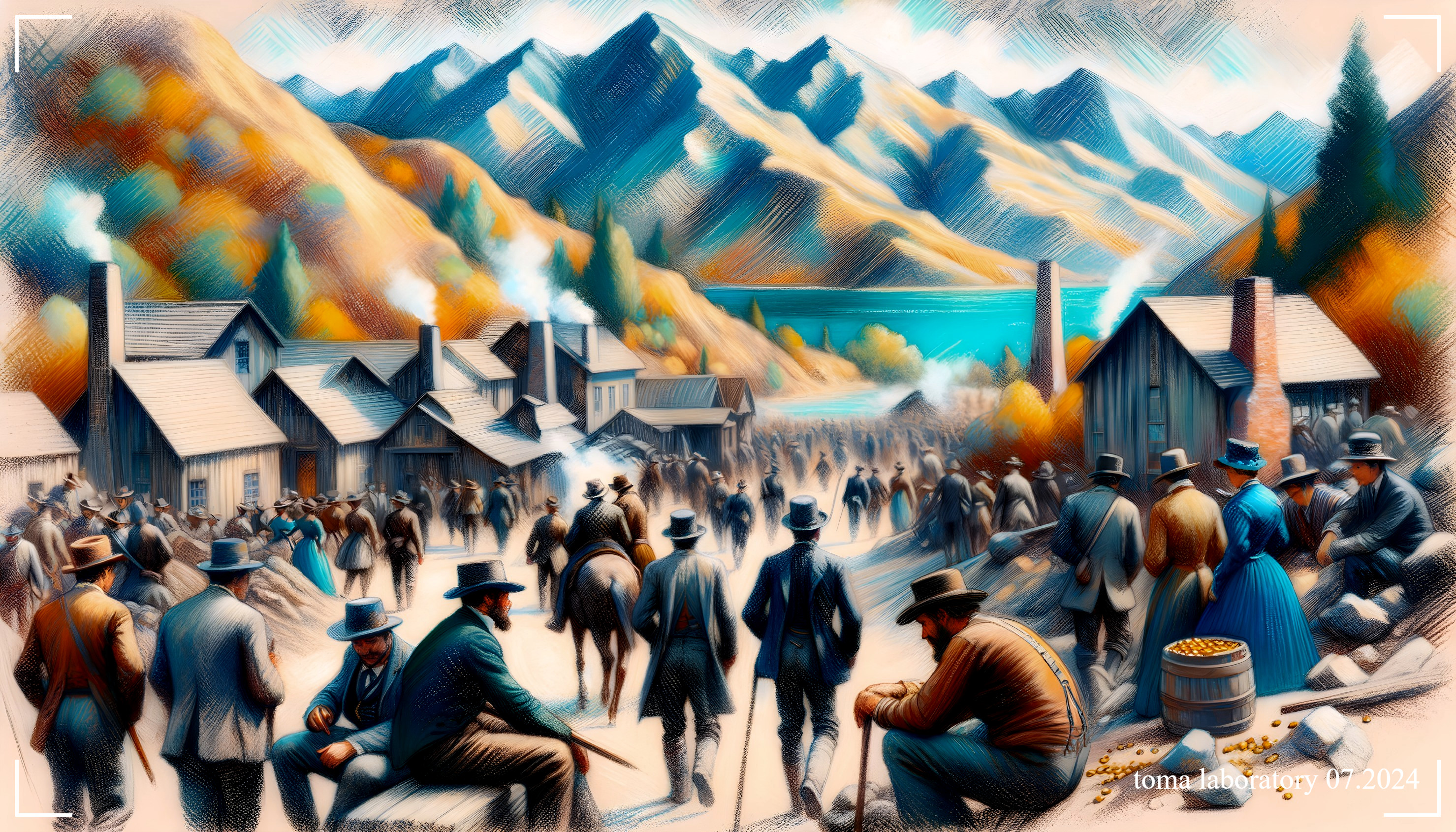 landscape image of a bustling old Western town, with crowds of people and horses against a backdrop of mountains and autumn trees - during california gold rush. 07.2024. Toma Laboratory.