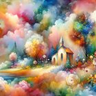 A vibrant, dreamlike landscape features a quaint church surrounded by colorful trees and flowers, set against a swirling backdrop of clouds and rich hues, evoking a sense of serenity and wonder.