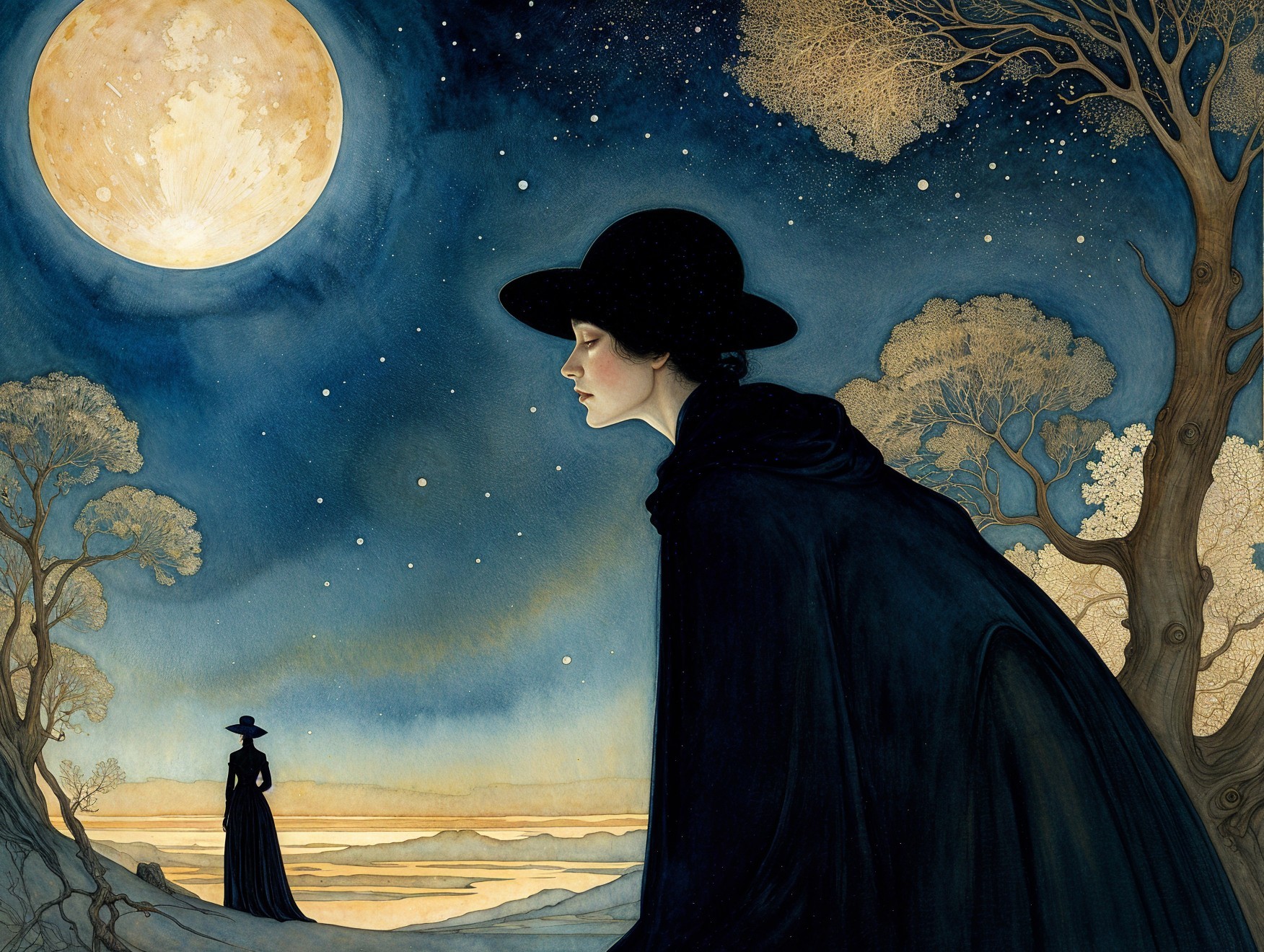 A serene scene featuring a woman in an elegant cloak, gazing at a starry sky with large moons. A shadowy figure stands in the background, enhancing the mystical atmosphere of the artwork.
