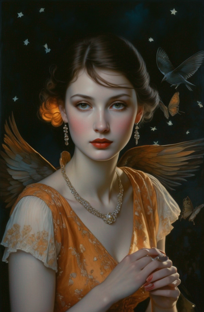 An angelic figure with wings holding a ginger cat, set against a starry night backdrop.