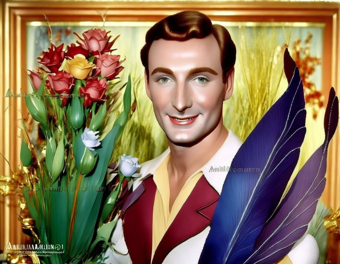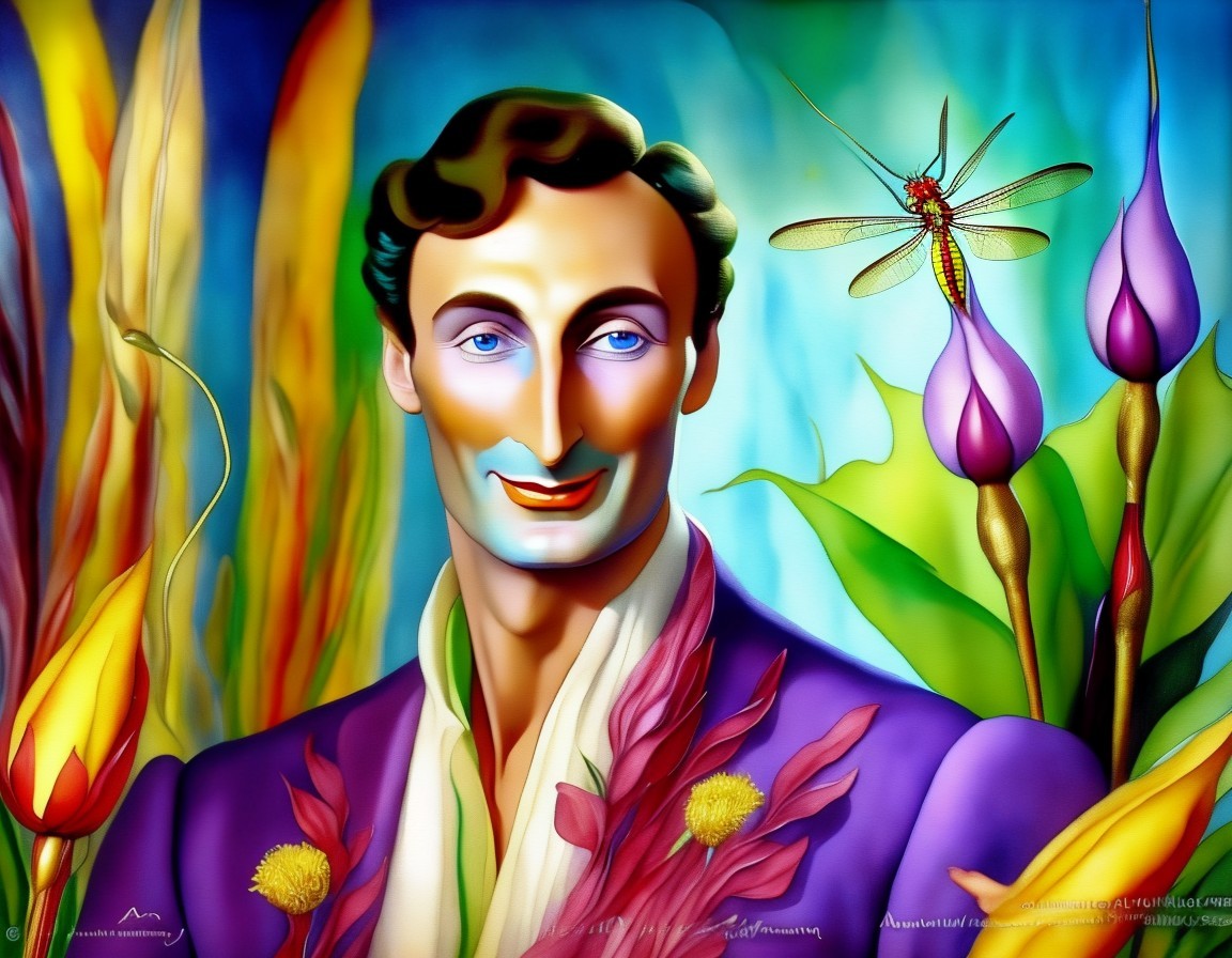 A vibrantly colored artistic illustration featuring a stylized male figure with dragonfly wings amongst lush, fantastical flora.