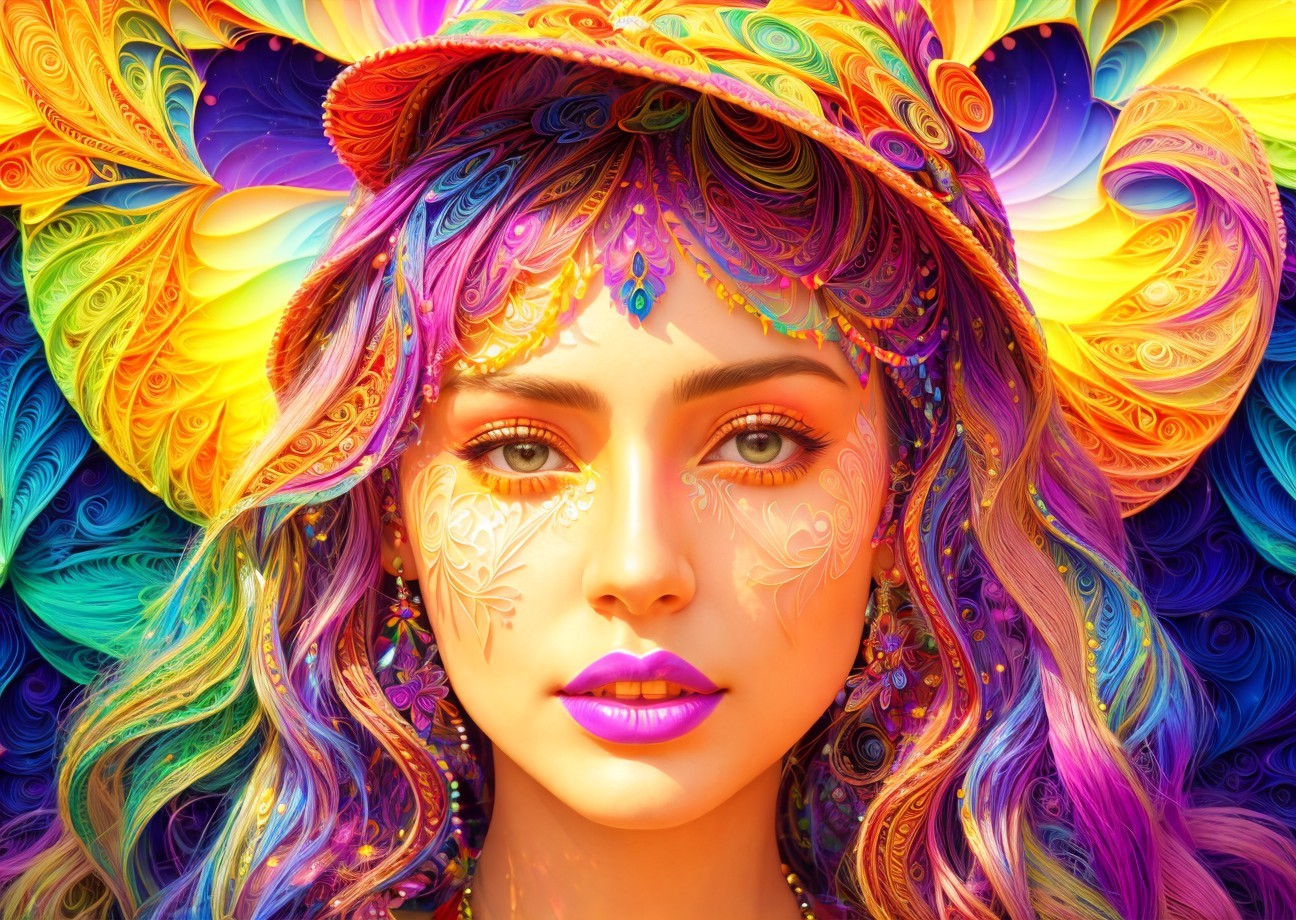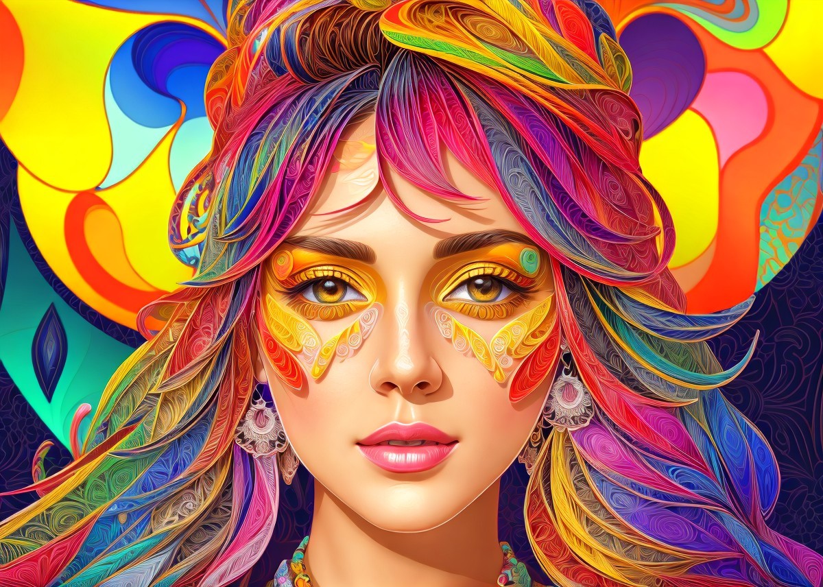 Headshot, high coloring, iridescence 1.4, stylized illustration with fractal patterned background, quilling, dynamic lighting, Stylized Woodblock print, Geometrical colorful portrait of a hippie woman, geometrical illustrative style,delicate floral motifs with abstract geometric shapes, creating a mesmerizing composition that blurs reality and imagination. Vibrant colors and dynamic brush strokes bring the depiction to life.