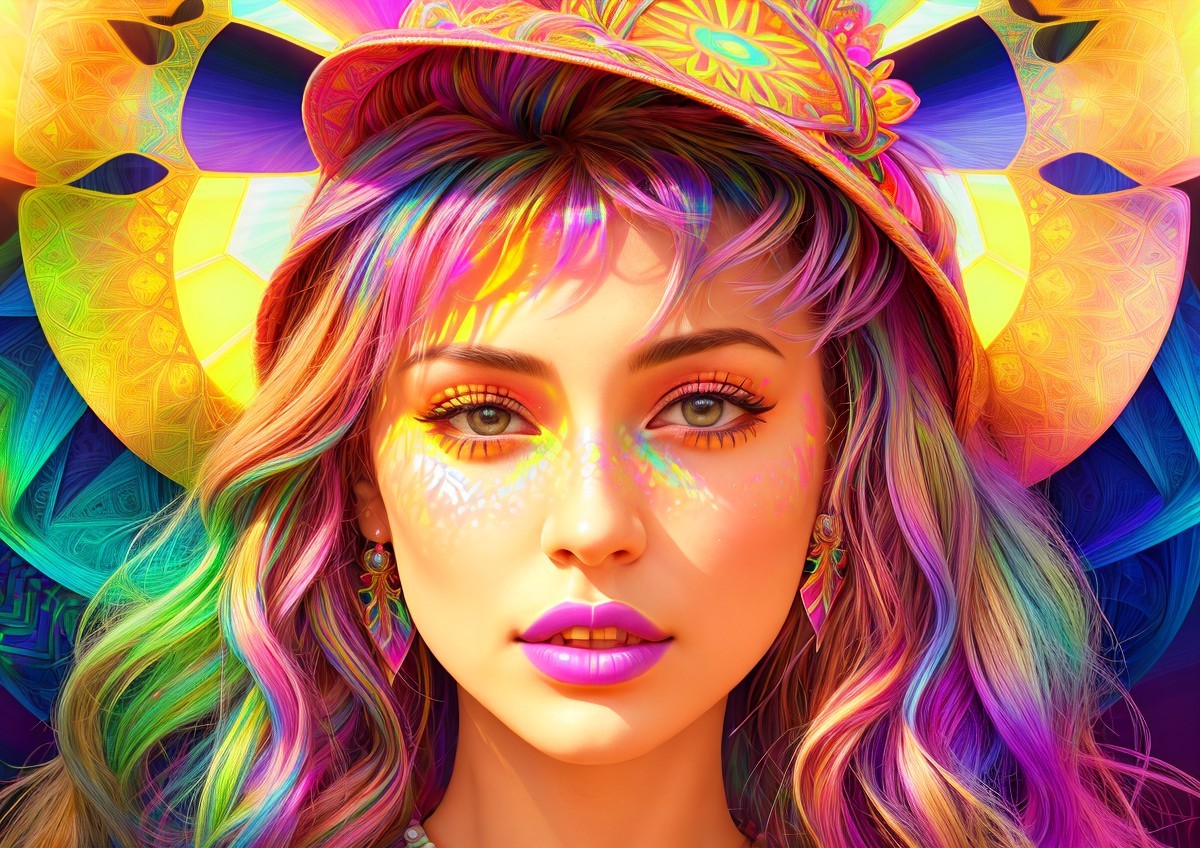Headshot of hippie woman, high coloring, iridescence 1.4, stylized illustration with fractal patterned background, dynamic lighting 1.7, 3d effects 1.8, shadow mapping 1.3, anisotropic filtering 1.7, ambient occlusion 1.5, custom_loss: black, triadic color scheme purple pink yellow, Pastel tones, comical sketch art in style of Overton Loyd and Didier Lourenço, anglogothic 1.6, radiance, maximalism, stylization 1.7, high coloring 1.9, mosscore 1.7, streamline_moderne, strict, hazy, spiritual, golden ratio, colorful iridescence, watercolor and ink painting 1.7, hues, plasticity 1.9, complexion 1.4, brightness 1.9, vector 13:11,