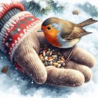 A cozy scene features a person in knitted gloves offering seeds to a small bird, while snow gently falls around them, and pine cones and berries decorate the snowy ground.