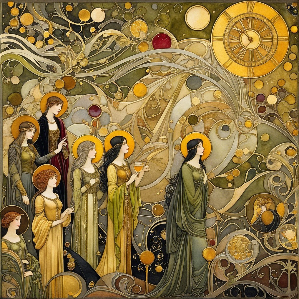 Art nouveau New Year’s Eve fantasy party,, 3rd century European miniature art. Velvet Black, Shabby, Dull Gold, olive green, burgundy, Golden Ratio, Surreal Fantasy, Elegant, High Definition Ultra Fine 3D Line, Zenangle Style, Watercolor Patchwork , Arthur Rackham Style, Paul Kidby, Gediminas Prankevicius, Jacek Jerka, Extremely Detailed, Intricate, Thoughtful, HDR, Fractal, Beautiful, Award Winning, Fantasy Look, Fantasy, Crisp Quality