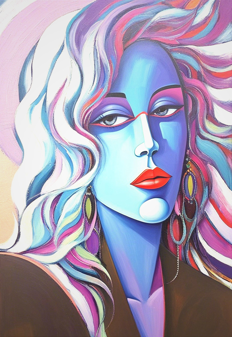 The image features a stylized portrait of a woman with striking blue skin and flowing hair in vibrant colors. She has bold makeup and large earrings, set against a soft, colorful background.