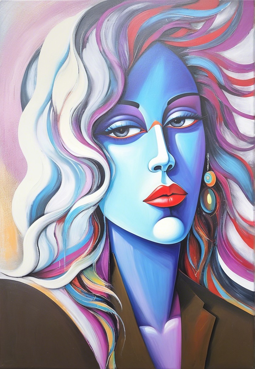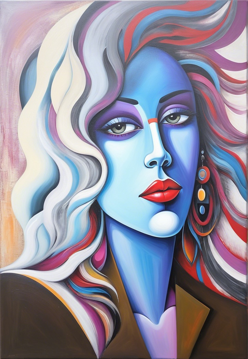 + Prompt:Vibrant and dynamic cubist composition, African abstract naive style, whimsical cartoon art with a touch of Ed Binkley & Tim Burton's exaggerated flair, diverse color shapes in a large, multi-layered canvas, emotionally charged abstract painting reminiscent of Alen Kopera, hues by William Turner, embodiment and linework by Ho Baron, a palette of hues ranging from warm earth tones to cool blues, incorporation of metallic colors for a foreboding touch inspired by Esao Andrews' biomorphic hallucinatory artworks. multi-layered eyes, stylized hairdo, post-avantgarde style, fine-line illustration reminiscent of bricolage, gradient inking, sloppily tesselated, graphic emphasis, visible textures, estranged light transitions, brightened abstract coherence and only curves in zentangle style, banging fractalisation, stylization, tesselated, stippled, color spaces, high contrast, dynamic lighting 1.7, plasticity 1.2, subsurface scattering 1.4, pin-up poster, Glossy synthetic textures juxtaposed with delicate skin, intricate shadows, evolving form,, subtle luminism and extreme variety of colors, slightly sculpted, flowing hair illusion, subsurface scattering, raytraced shadows, visible textures, bokeh, brightened color palette, pointilism, ethereal atmosphere, layers of fabric blend with turbulent flares, liminal hues by Ho Baron and Man Ray, lighting by Ed Paschke, wavery texture patchwork, pellucid details, juminocore elements, grunge aesthetic, 1:1 aspect ratio, high quality backdrop, vibrant colors, themes of serenity and sobriety, reconstructionism