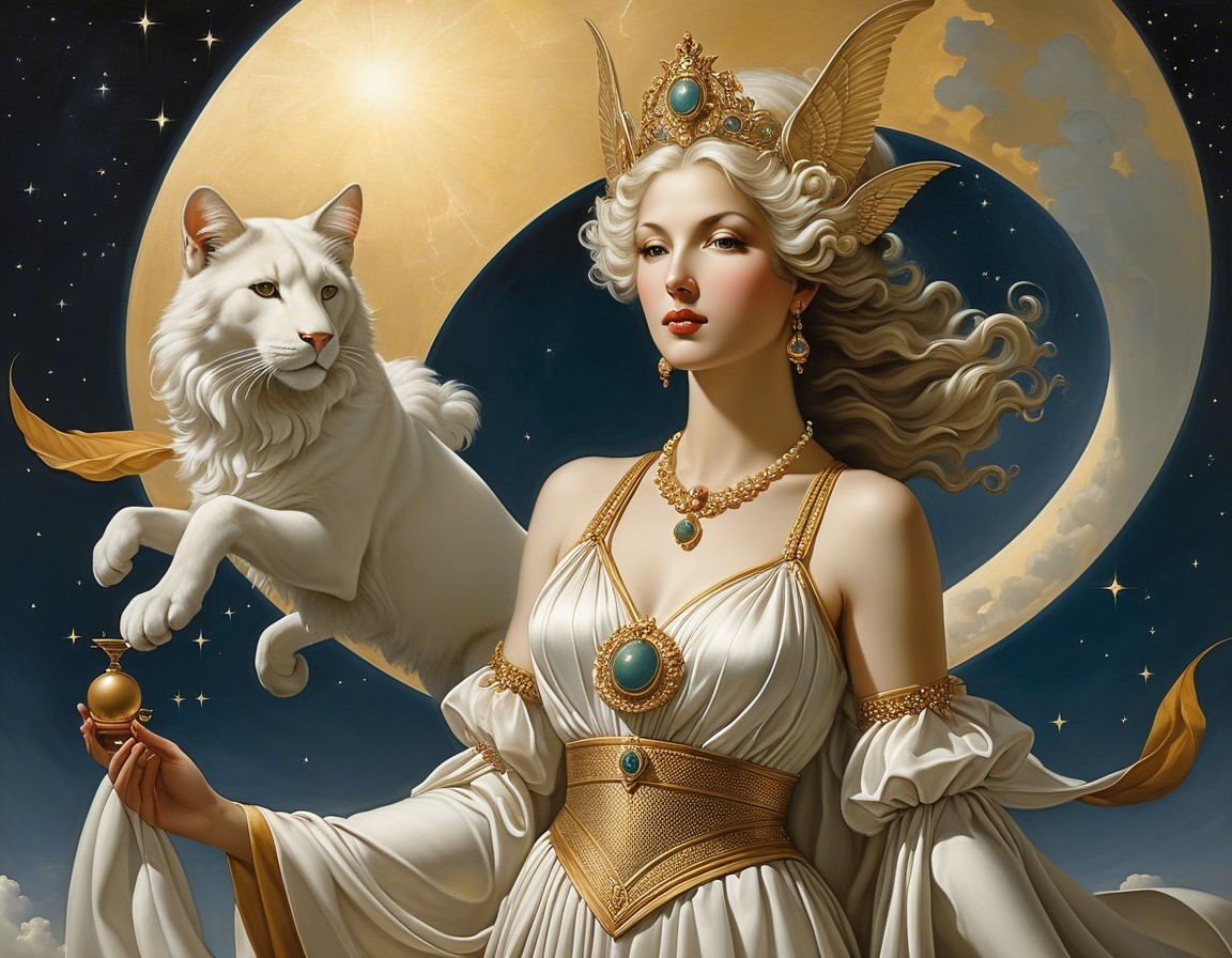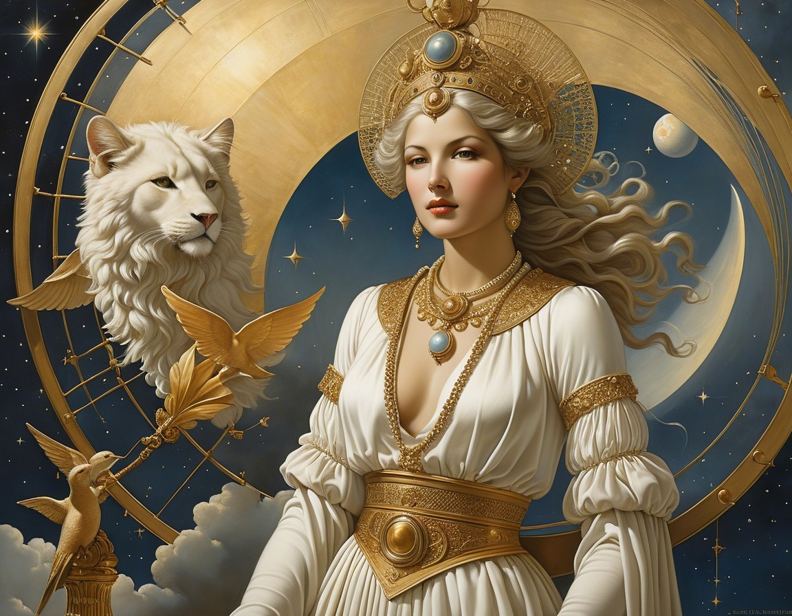 A celestial woman in a flowing white gown sits gracefully, holding a white bird. She’s adorned with a jeweled crown, surrounded by swirling clouds and a moonlit night sky, radiating ethereal beauty.