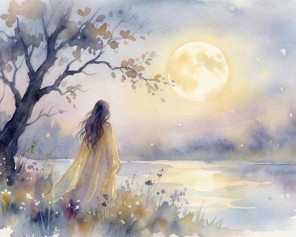 Ethereal beautiful young woman, dreamy portrait, porcelain skin, almond-shaped amber eyes, dark eyeliner, lush eyelashes, intense gaze, straight nose, coral-pink lips, jet-black wavy hair, abstract blue and purple background, golden and cream hues, yellow-orange flowers in hair, vintage colour palette, cool tones, warm accents, vintage artistic ambiance, East Asian woman, rosy blush, red eye shadow, full lips, side profile, downward gaze, traditional updo, vibrant flowers, intricate gold and pearl earrings, embroidered dress, EmmAI ethereal background, blooming flowers, Autumn garden, muted colour palette, elegant lighting, intricate details, high-resolution digital art.