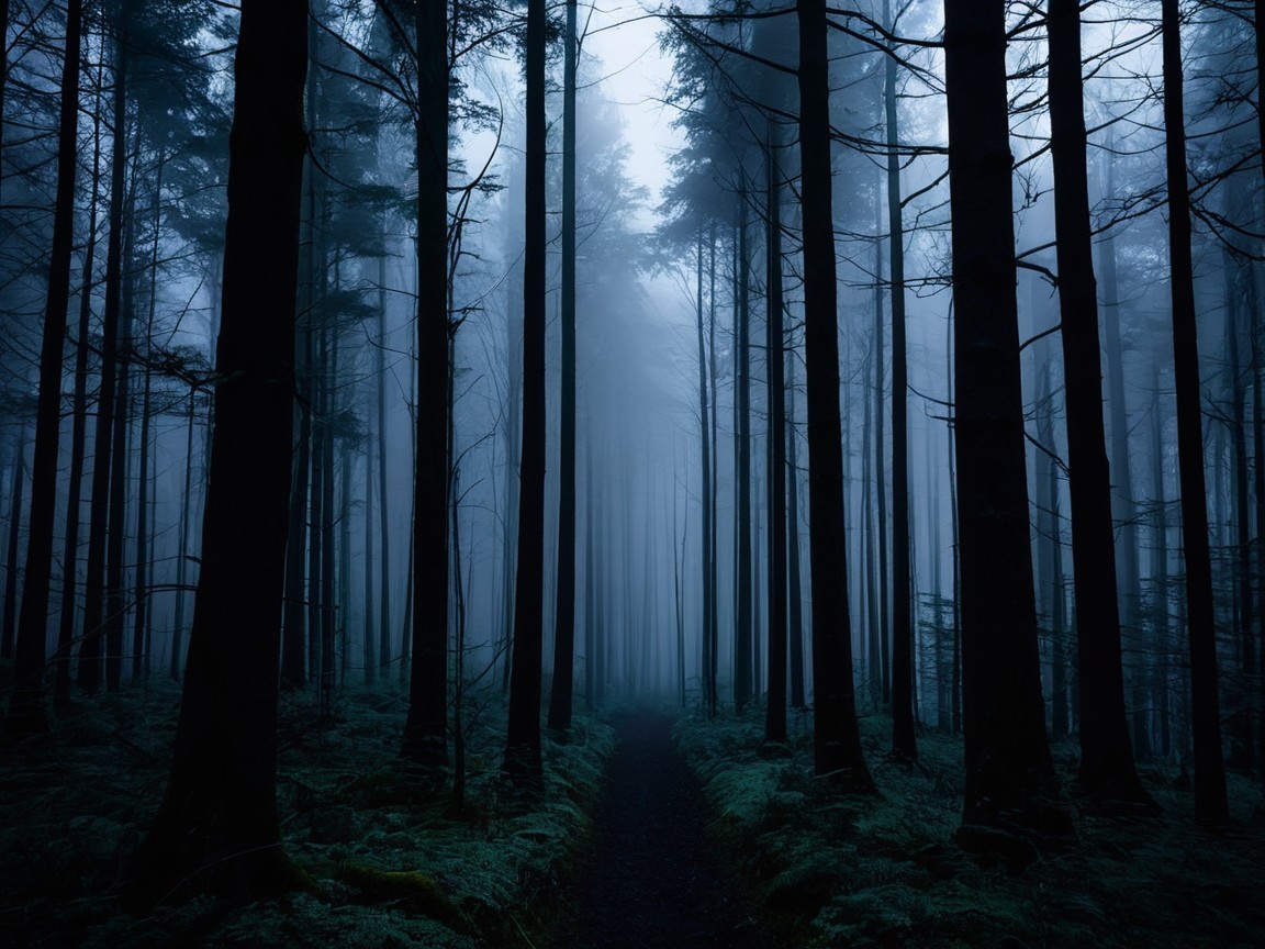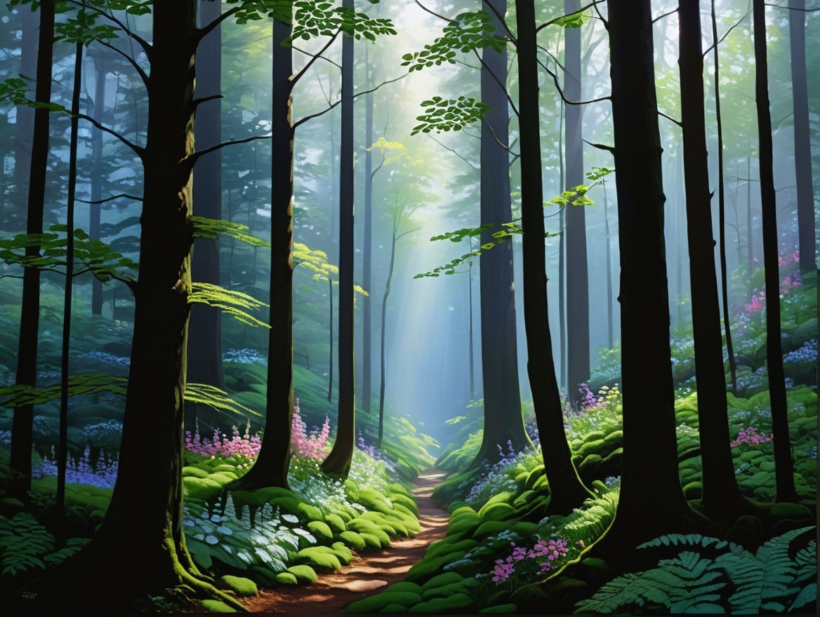 A serene forest scene with tall, green trees and dappled sunlight filtering through the leaves. A gentle stream flows alongside colorful flowers, while a butterfly flits above the vibrant landscape.
