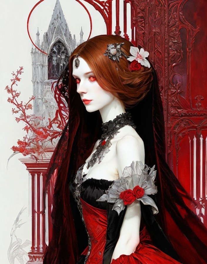 Auburn-Haired Woman in Black Dress with Floral Backdrop