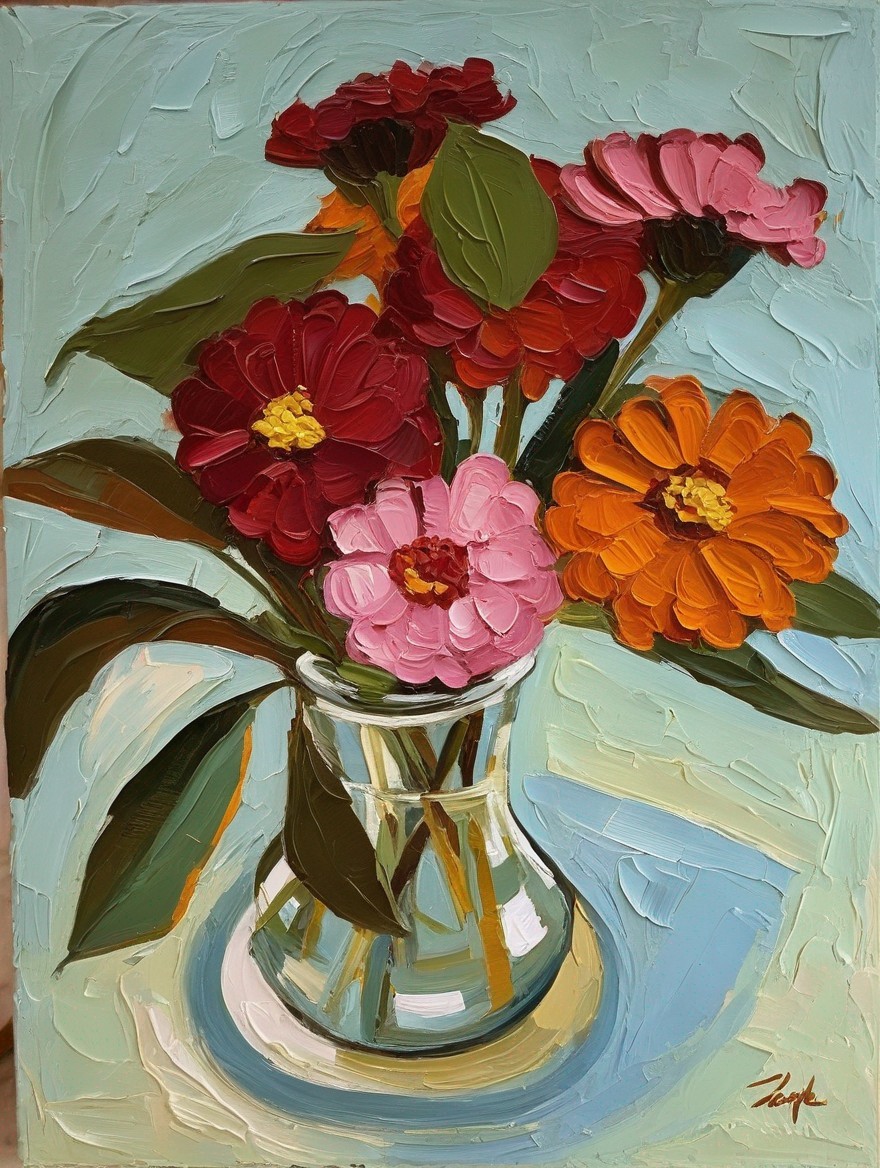 A vibrant painting of colorful flowers in a clear vase, featuring thick, textured brushstrokes and a lively palette.