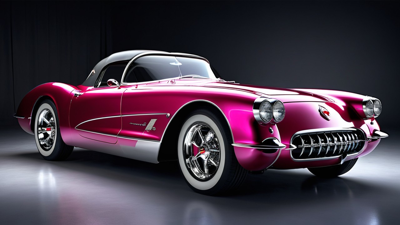 A striking classic car with a vibrant pink and white exterior, featuring elegant curves and chrome accents. Its vintage styling and sleek design exude retro charm and sophistication.