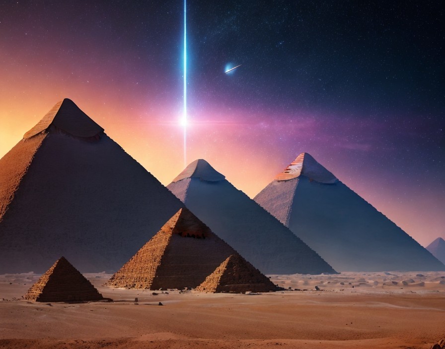A stunning night sky with a cosmic light beams over the Egyptian pyramids, amidst a desert landscape under a starry sky.