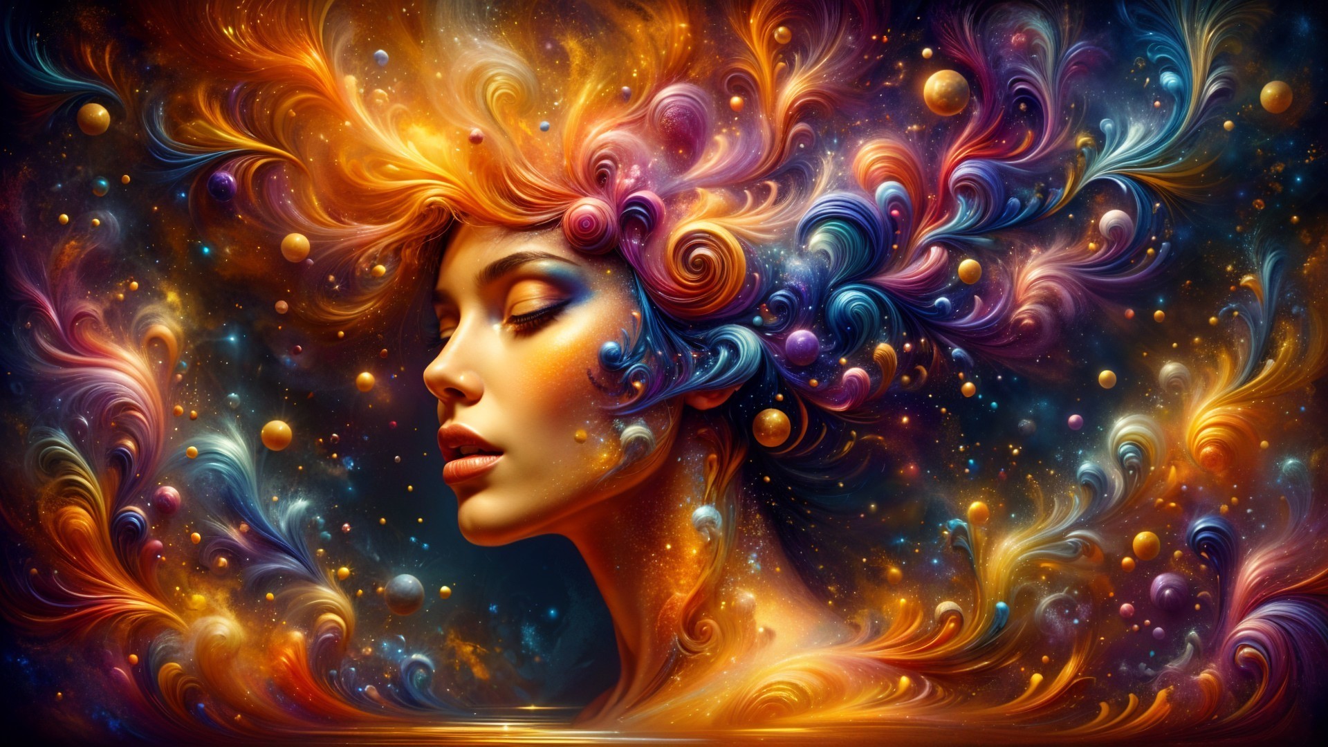 Close-up of the profile of a woman from her right side, her face and neck painted with shimmering gold, orange, and light blue dots, against a cosmic and fantastical background of swirling, colorful elements. Her hair is rendered as colorful, ethereal, fractal-like wisps and curls, predominantly