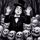 A cheerful Lego figure in a red tuxedo stands confidently in a forest scene, surrounded by playful skeleton figures. Colorful Lego pieces are scattered on the ground, adding to the whimsical atmosphere.