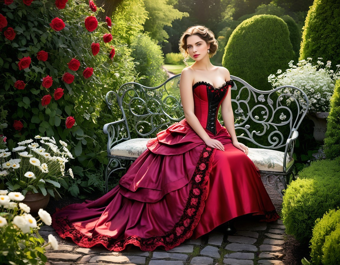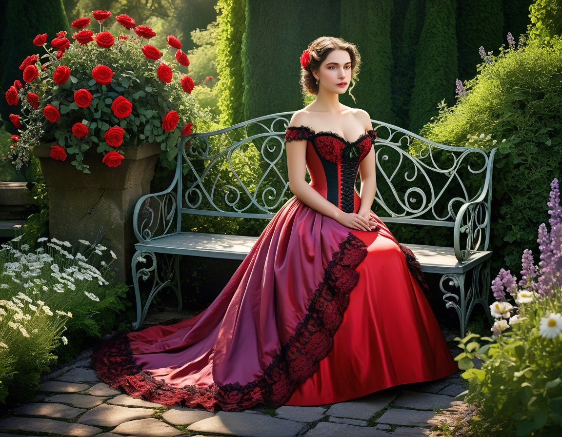 A woman in a vintage dress with a floral crown sits on a bench, surrounded by lush flowers in a garden.